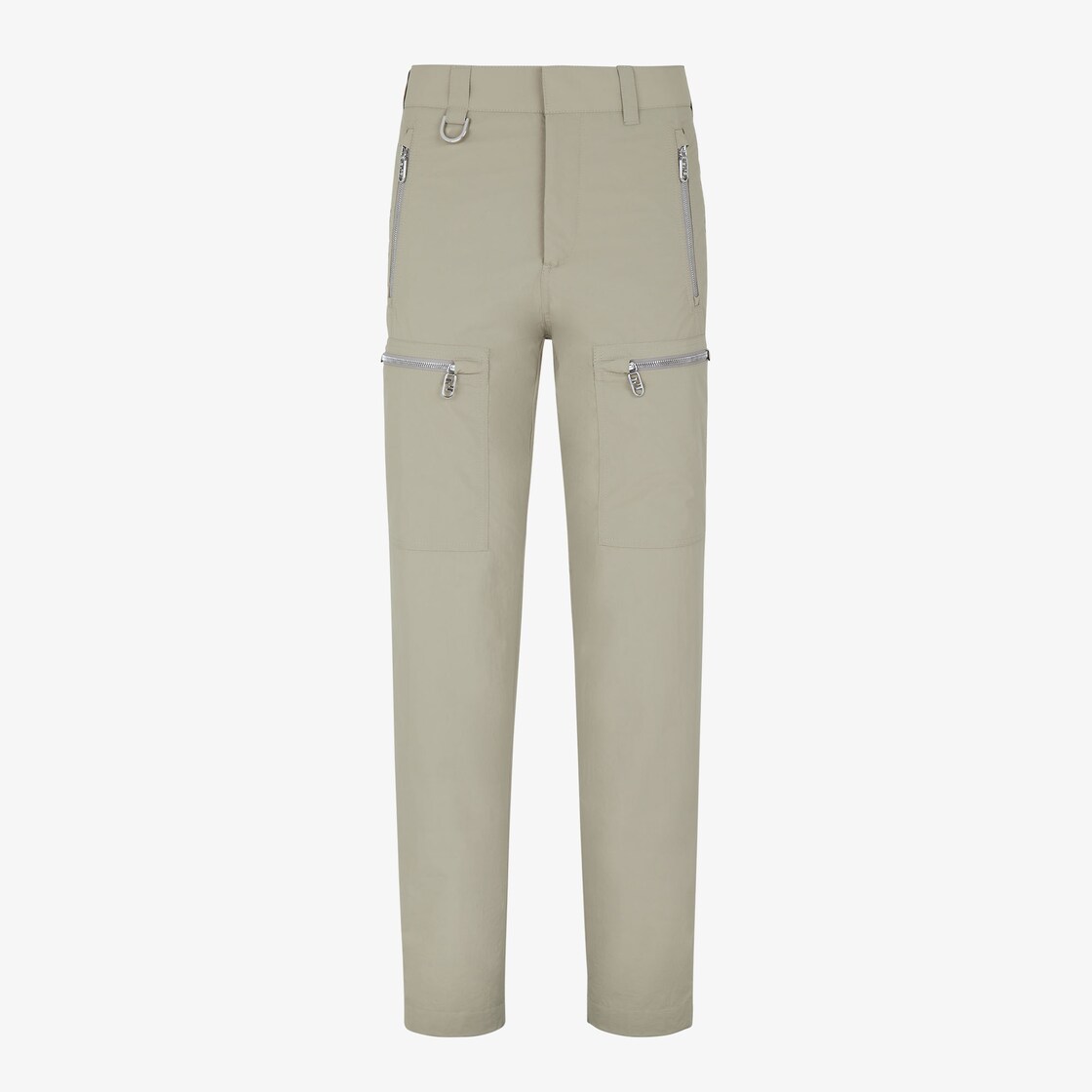 Straight-cut cargo trousers. Side straps for waist adjustment with press stud buttons. Zipped side pockets and zipped patch pockets on the leg. Concealed zip fastening. Made of dove grey tech nylon. All the pockets are embellished with a Fendi O’Lock metal slider with palladium finish.