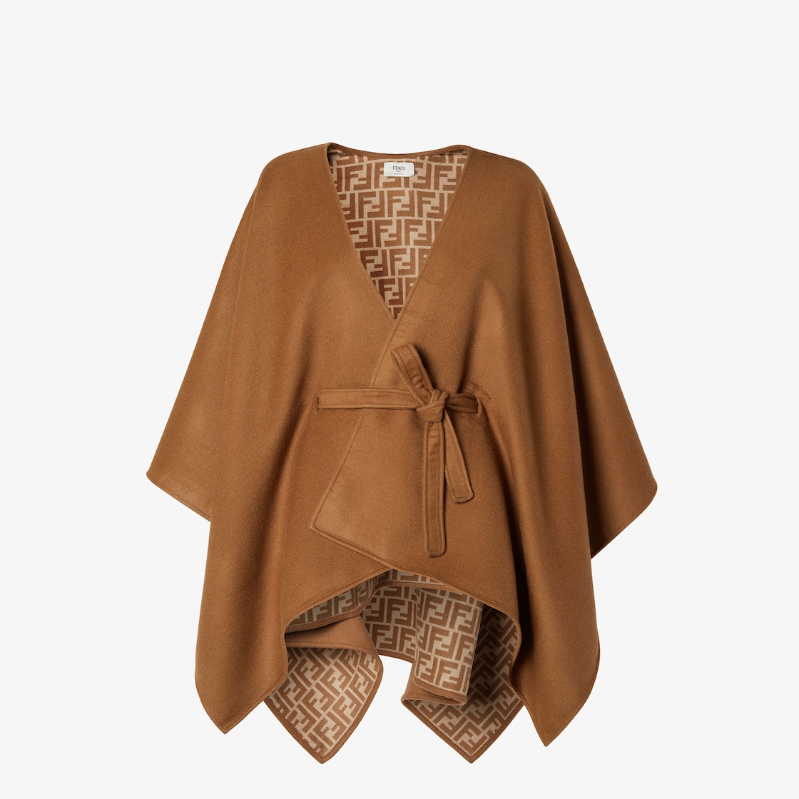 Enveloping poncho with matching removable belt. Made of an exquisite blend of wool, cashmere and silk in camel-coloured double-sided fabric. The interior is customised with the iconic FF motif in a slightly contrasting shade. Perfect to complete seasonal looks.