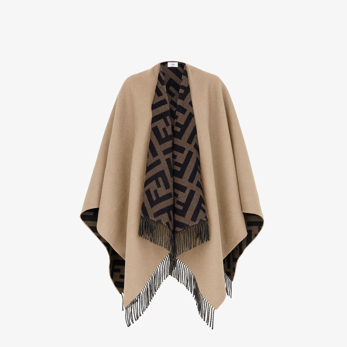 Reversible wool and cashmere poncho. One side is branded with brown and black oversized FF motif, while the other is plain beige. Fringed hems.