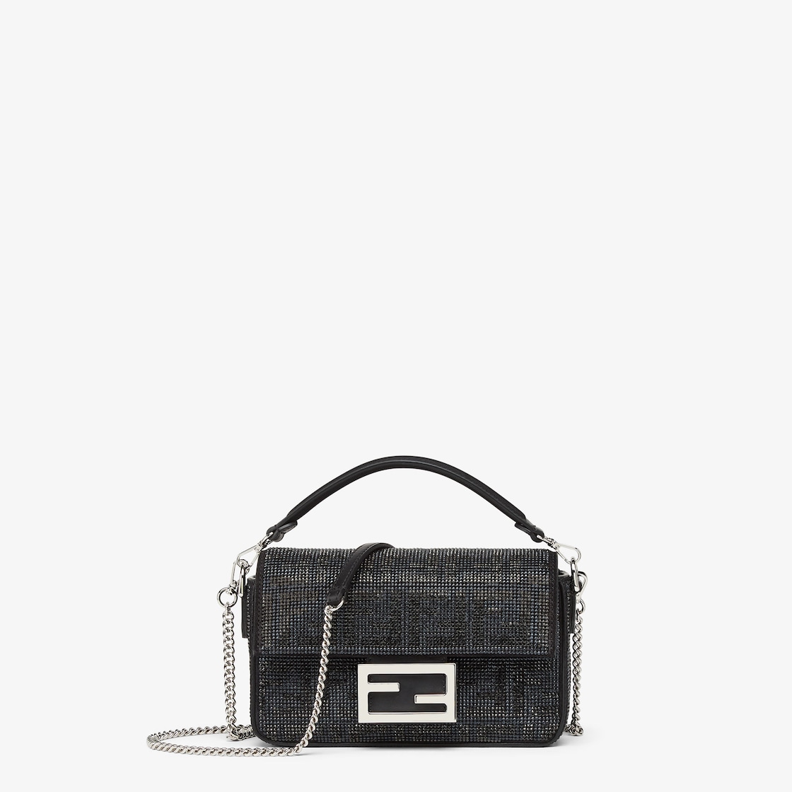Iconic small Baguette bag made of suede and entirely covered in crystals and multi-faceted studs that create the iconic FF motif all over in black. Decorated with an FF clasp.