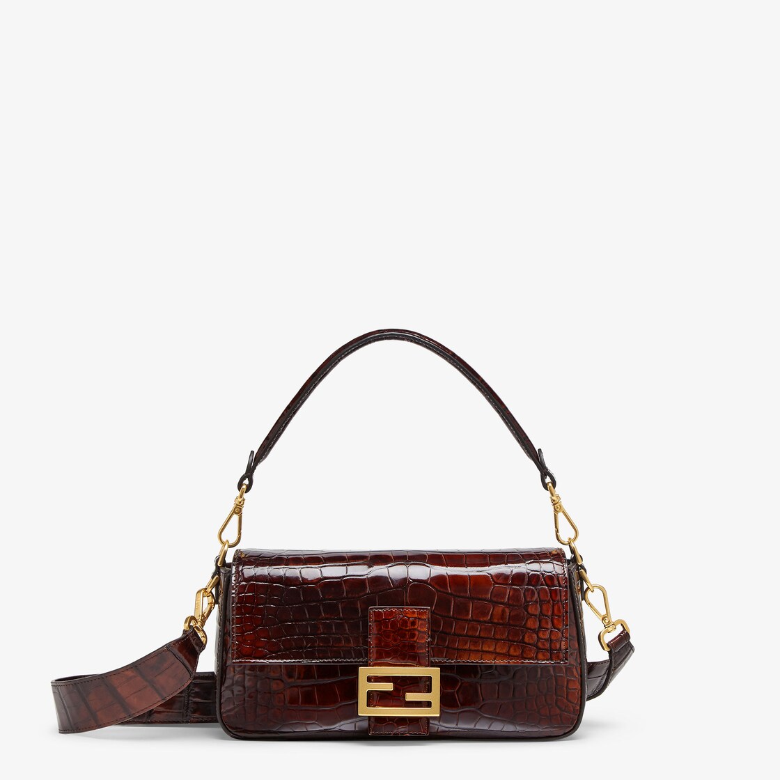 Iconic medium Baguette bag made of exquisite dark brown crocodile leather. Each style is hand-finished through a special technique that creates a tortoiseshell effect with unique shading. Decorated with an FF clasp.