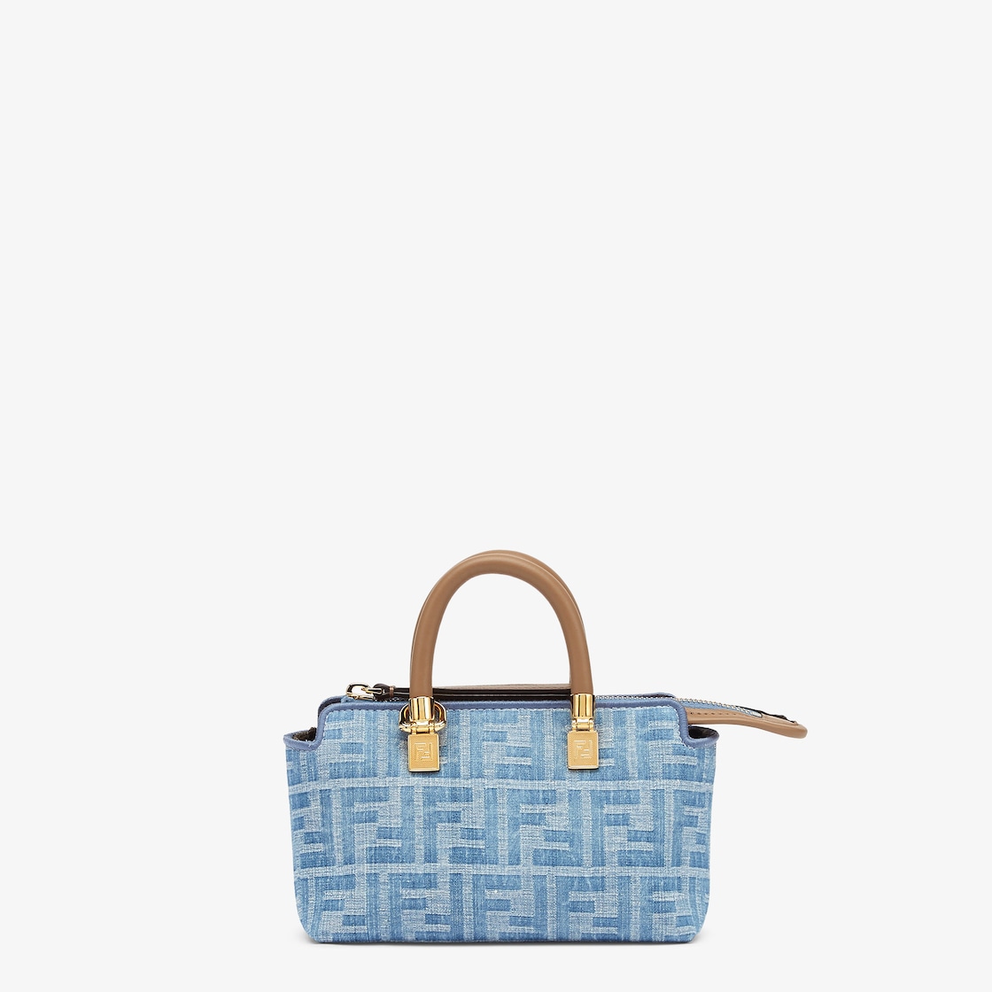 Mini By The Way Boston bag made of light blue denim-effect fabric with an FF motif. Embellished with beige leather details and tubular handles. Zip fastening.