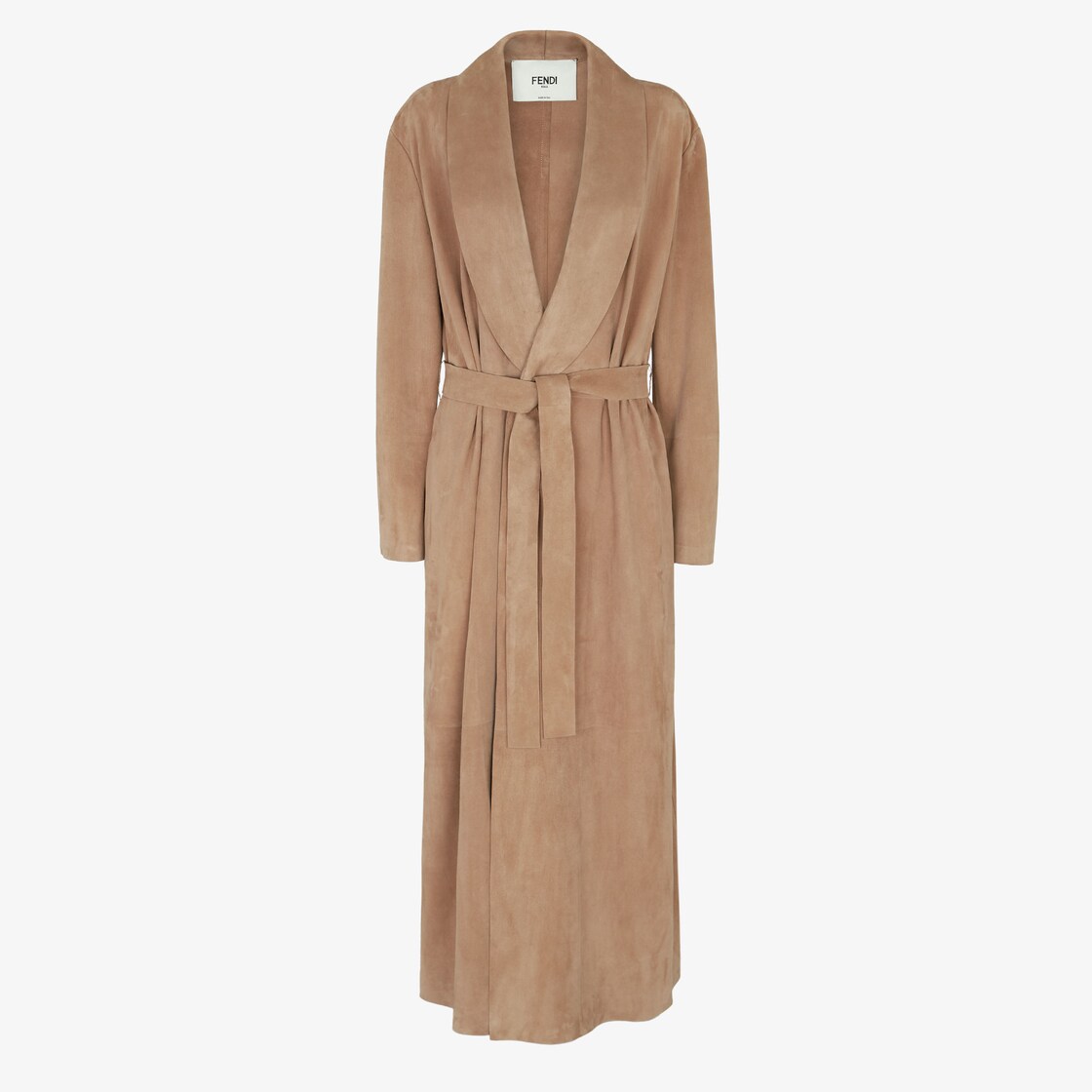 Long wrap coat. Shawl collar and long sleeves with dropped shoulders. Fastens with matching belt. Made of light brown lightweight suede. Unlined. Finished with matching Fendi Roma lettering embroidered on the left sleeve.
