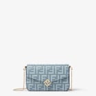 FF Diamonds compact wallet with geometric flap and diagonal FF logo. Interior compartment with four card slots. Thin, detachable chain shoulder strap. Made of matcha green calfskin with iconic embossed FF motif. Gold-finish metalware.