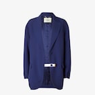 Single-breasted jacket with peak lapel collar and low set-in sleeves with elasticated cuff. Breast pocket and welt pockets with flap on the front. Button fastening. Made of dark blue lightweight mohair fabric. Elastic strap inserted at the hem and removable leather toggle, both with buttonhole adjustment, to modify the fit and define the volume of the silhouette. Lined in micro FF jacquard in the same tones.