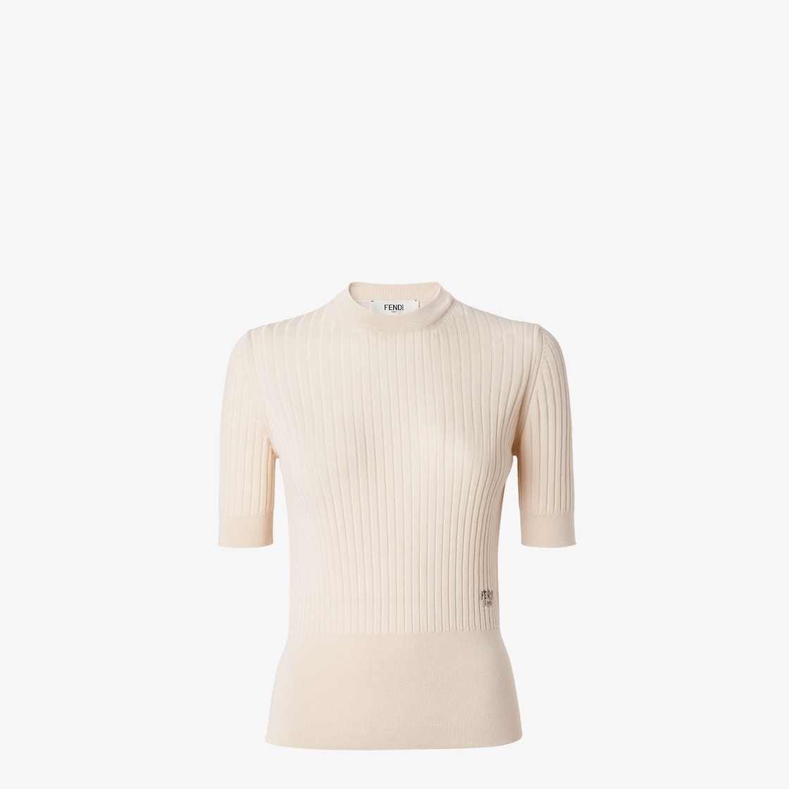 Fitted short-sleeved crew-neck jumper. Made of beige ribbed wool yarn. Customised with yarn embroidery logo on the front.