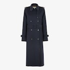 Trench-style long double-breasted coat. Shirt collar, epaulettes on the shoulders and cuffs with adjustable straps. Straight cut with rounded hem at the back and matching belt at the waist. Button fastening. Made of blue double-sided wool fabric. Lining customised with a contrasting FF motif.