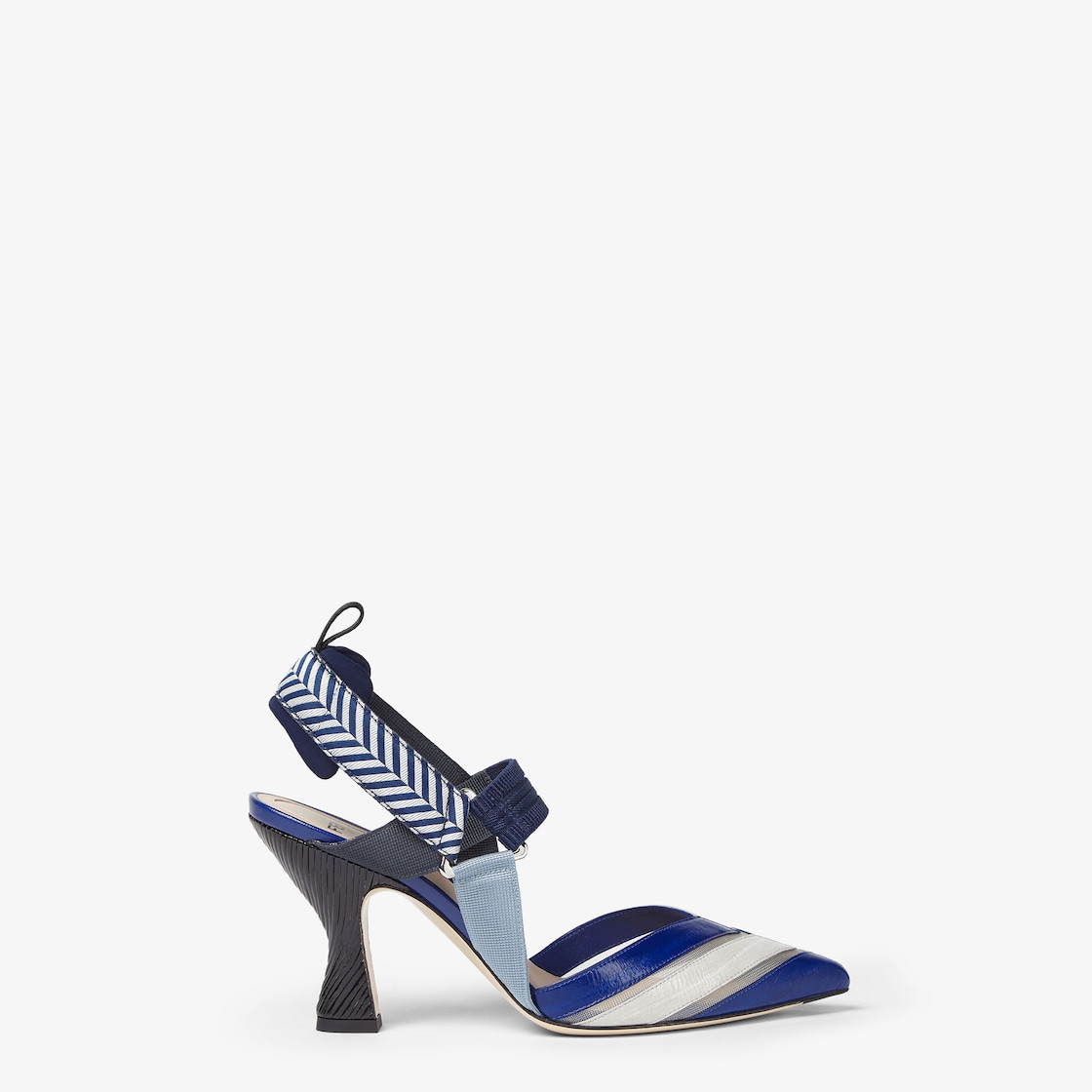 White and blue hagfish and mesh high-heeled slingbacks