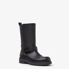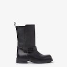 Biker boots with wide leg and rounded toe. Made of black tumbled calf leather. Tone-on-tone ankle strap with the Baguette buckle. Rubber sole and heel with Fendi lettering on the side.