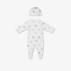 White jersey baby set with multicoloured all-over horse print on the playsuit and hat.