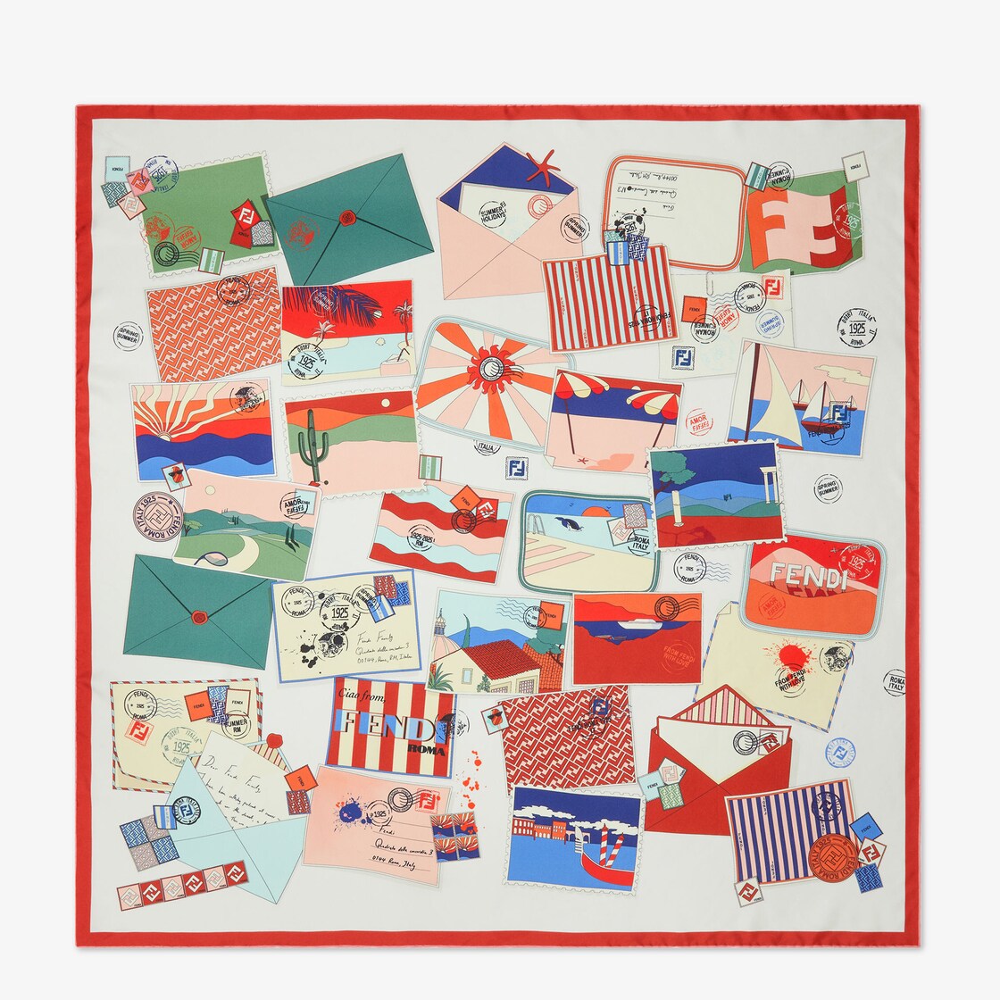 Square silk foulard. Customised with the Fendi Postcards motif, a collage of archive postcards that features contrasting summer landscapes, from the coast to the Tuscan countryside and the rooftops of Rome. Ivory white background, framed by colour-block edges. Hand-rolled hems.