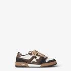 Fendi Match slip-on trainers. Made of white calfskin with charcoal grey and dark brown long-haired split-leather details that create the FF motif on the sides. Embellished with brown terry laces, threaded to form the FF motif. An inner elastic makes it easy to slip into the shoe. Covered rubber cupsole with brown bumper.