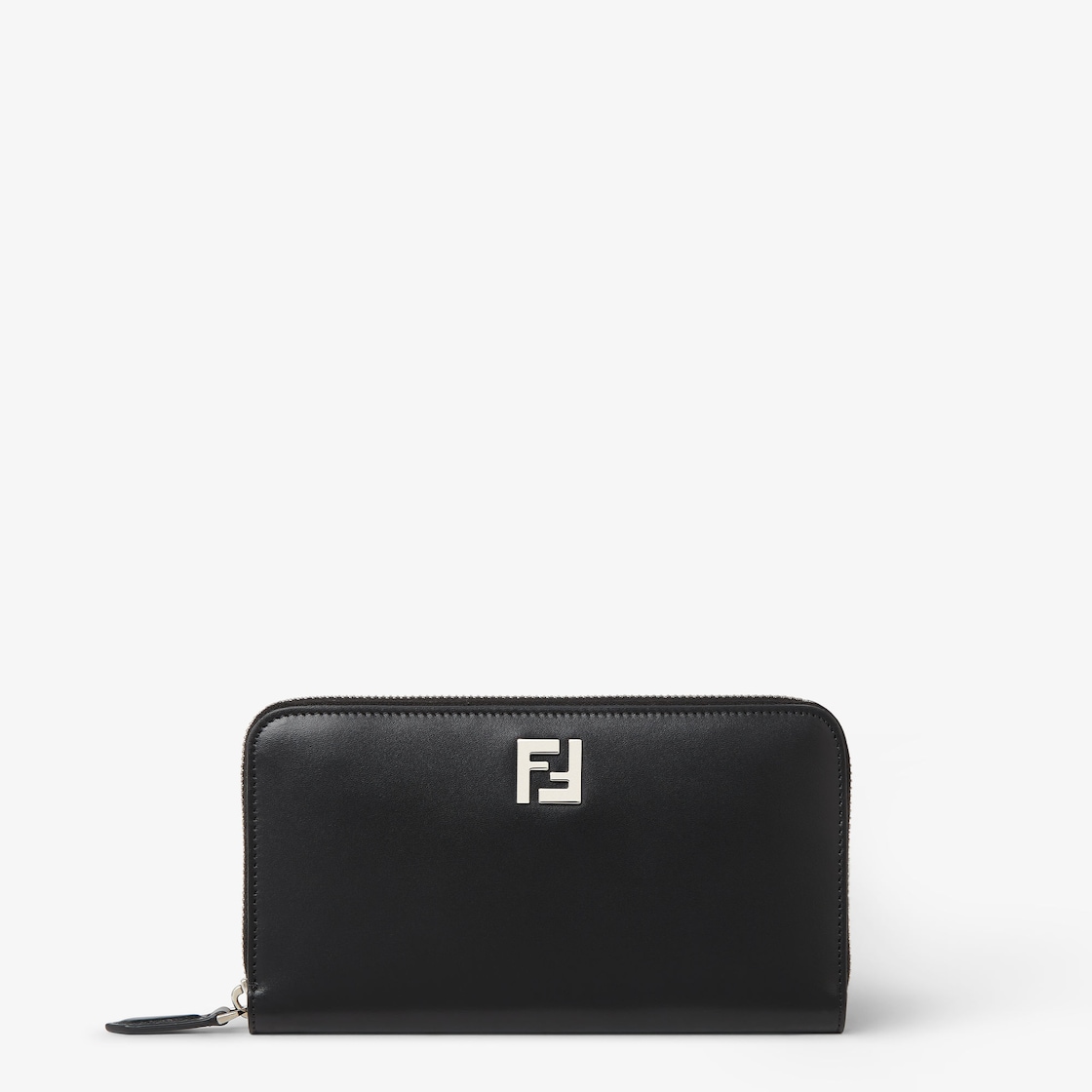 Wallet with zip. Organised into three gusseted compartments with eight card slots and a zip pocket. Made of black leather with black FF Canvas details. Metal Squared FF motif with a palladium finish.