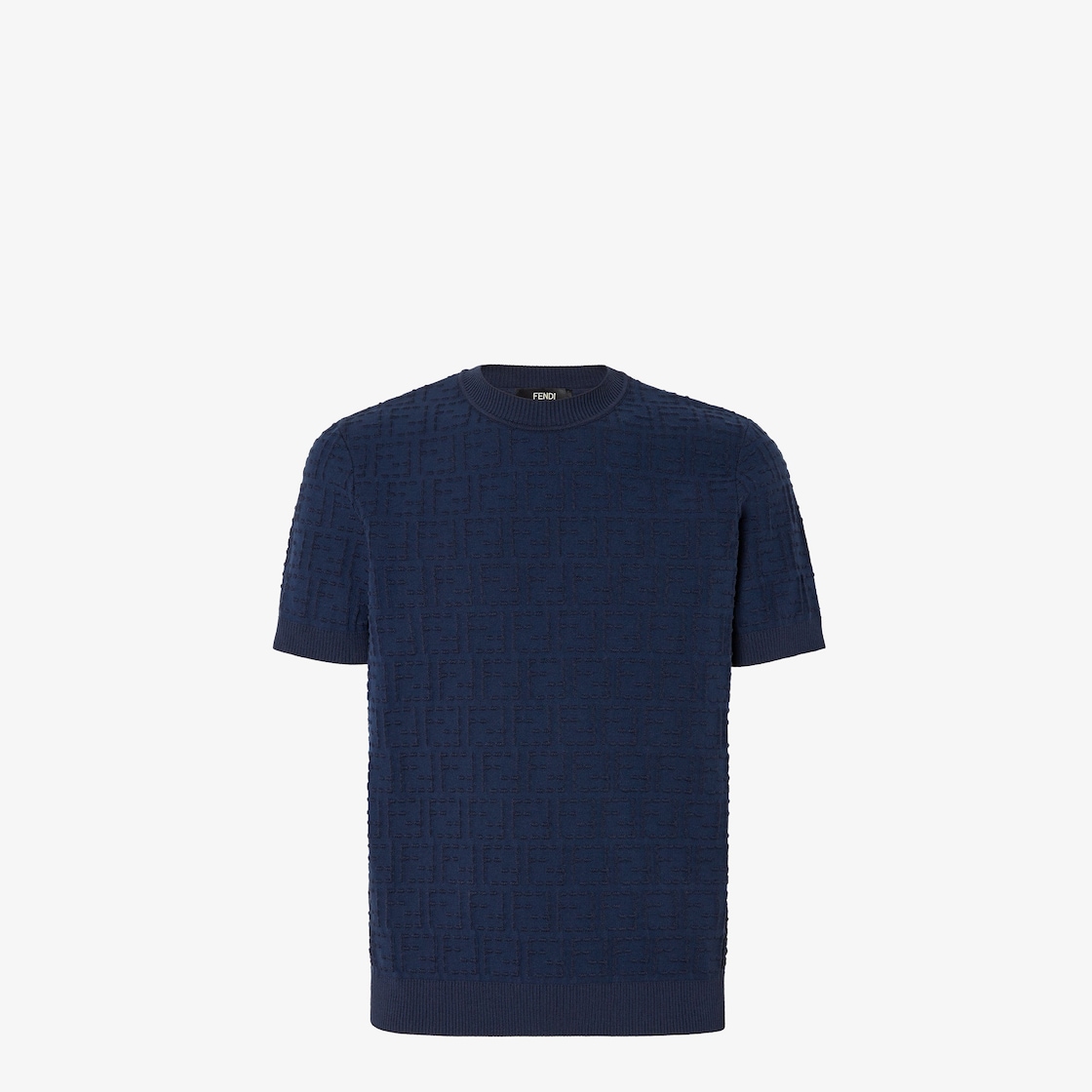Crew-neck pullover with short sleeves. Made of blue cotton yarn. Embellished with matching colour all-over FF Selleria stitching. Finished with ribbed edges.