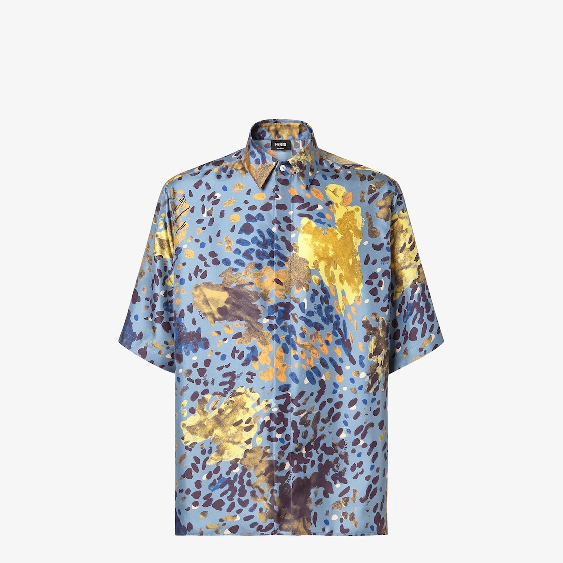 Short-sleeved, oversize shirt. Mid Italian collar and straight hem. Concealed button fastening. Made of silk with an all-over Falena print in airforce blue and yellow.