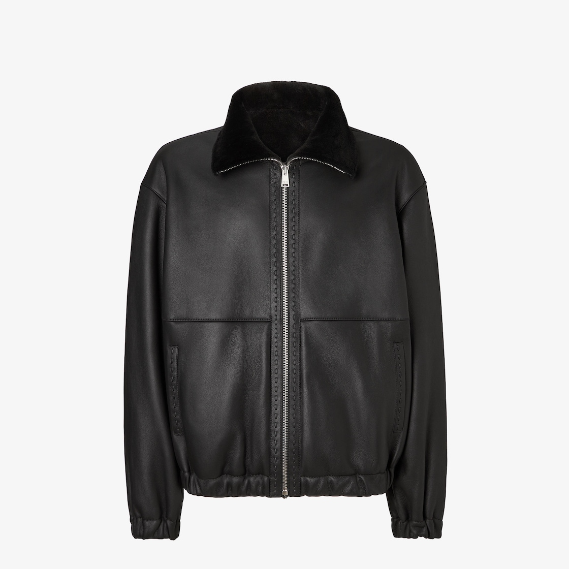 Oversized blouson jacket with high collar. Elasticated cuffs and edge. Side pockets and low-set sleeves. Zip fastening with double slider. Made of black leather, with shaved shearling lining in the same tones. Embellished with matching Selleria stitching and embossed FF detail on the back of the collar. Palladium-finish metalware.