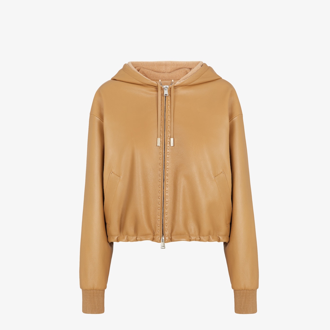 Cropped bomber jacket with drawstring hood. Long, low-cut sleeves with rib-knit cuffs. Side pockets and drawstring hem. Zip fastening with double slider. Made of soft, beige grained leather. Lined in tone on tone cashmere. Finished with hand-sewn tone-on-tone macro Selleria topstitches, an emblem of the iconic Selleria workmanship handed down through generations of Fendi artisans since 1925.