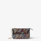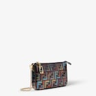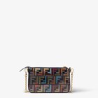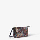 Baguette pouch made of glazed fabric with multicoloured FF in metallic lamé yarn. Zip closure with zip-pull featuring the iconic FF motif in metal. Lined interior, pocket with card holder slots and gold-finish metalware. Can be carried by hand, under the arm or cross-body thanks to the short, slim chain shoulder strap and long dark blue calfskin shoulder strap, both detachable. Holds a 6.7-inch smartphone and keys. The card holder is integrated inside the bag.