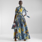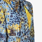 Long, V-neck dress with a flowing silhouette and foulard detail. Shirt cuffs and side slit. Lined. Made of Light blue silk taffeta with the Falena print all-over in black and yellow tones.