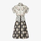 Midi dress with short cocoon sleeves, shirt collar fastened with a single button and cut-out motif on the front. Fitted to the waist and flared skirt. Lined. Full-length skirt zip on the front. Made of black and white organza lace. The print combines the iconic Fendi Pois motif with the collection’s Fendi Bouquet motif in the same colours with pink and yellow details.