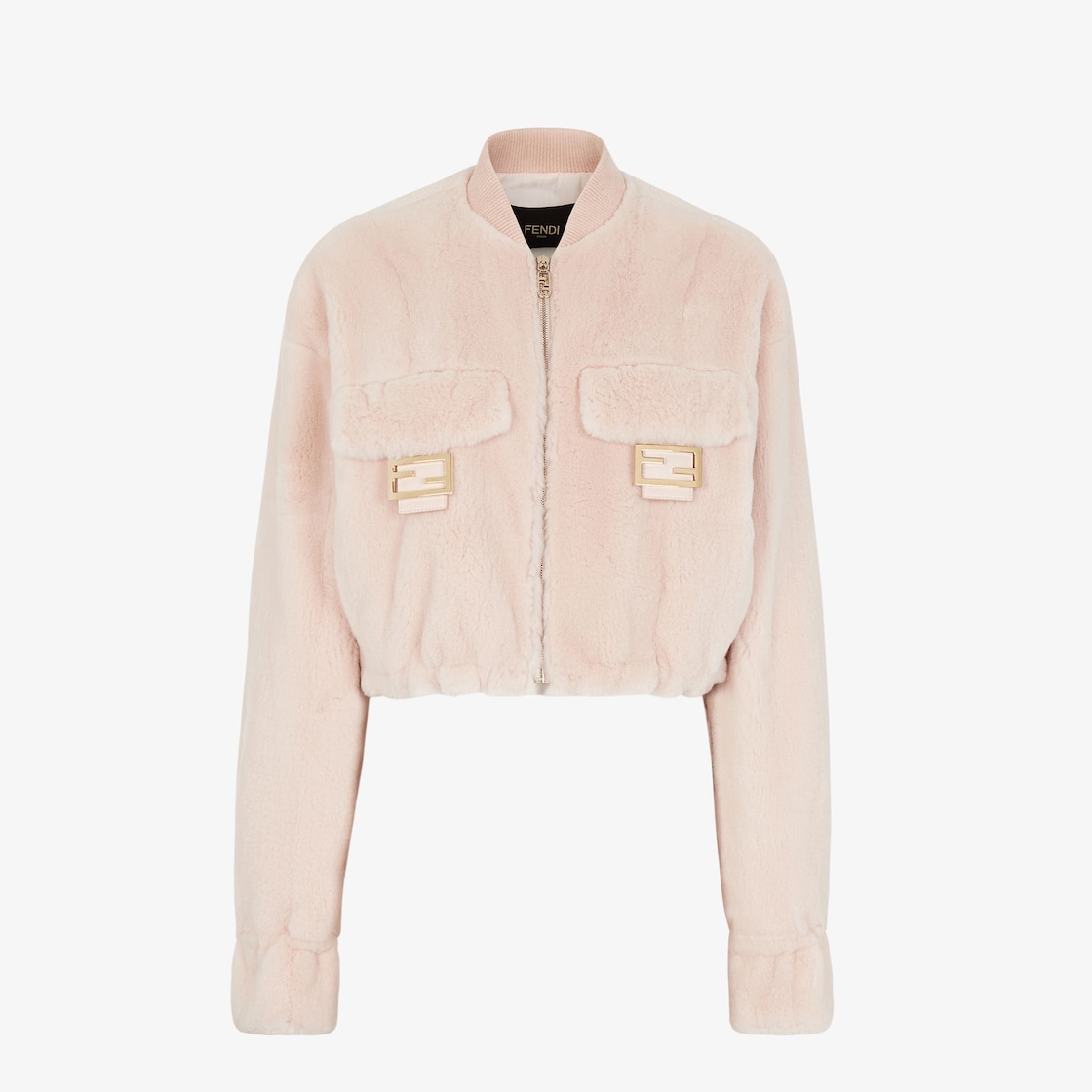 Cropped jacket with bomber jacket knit collar and drawstring hem and cuffs. O’Lock zip fastening. Made of pink shaved mink. The chest pockets are embellished with a flap and gold-finish metal FF Baguette buckle. FF jacquard nylon lining.