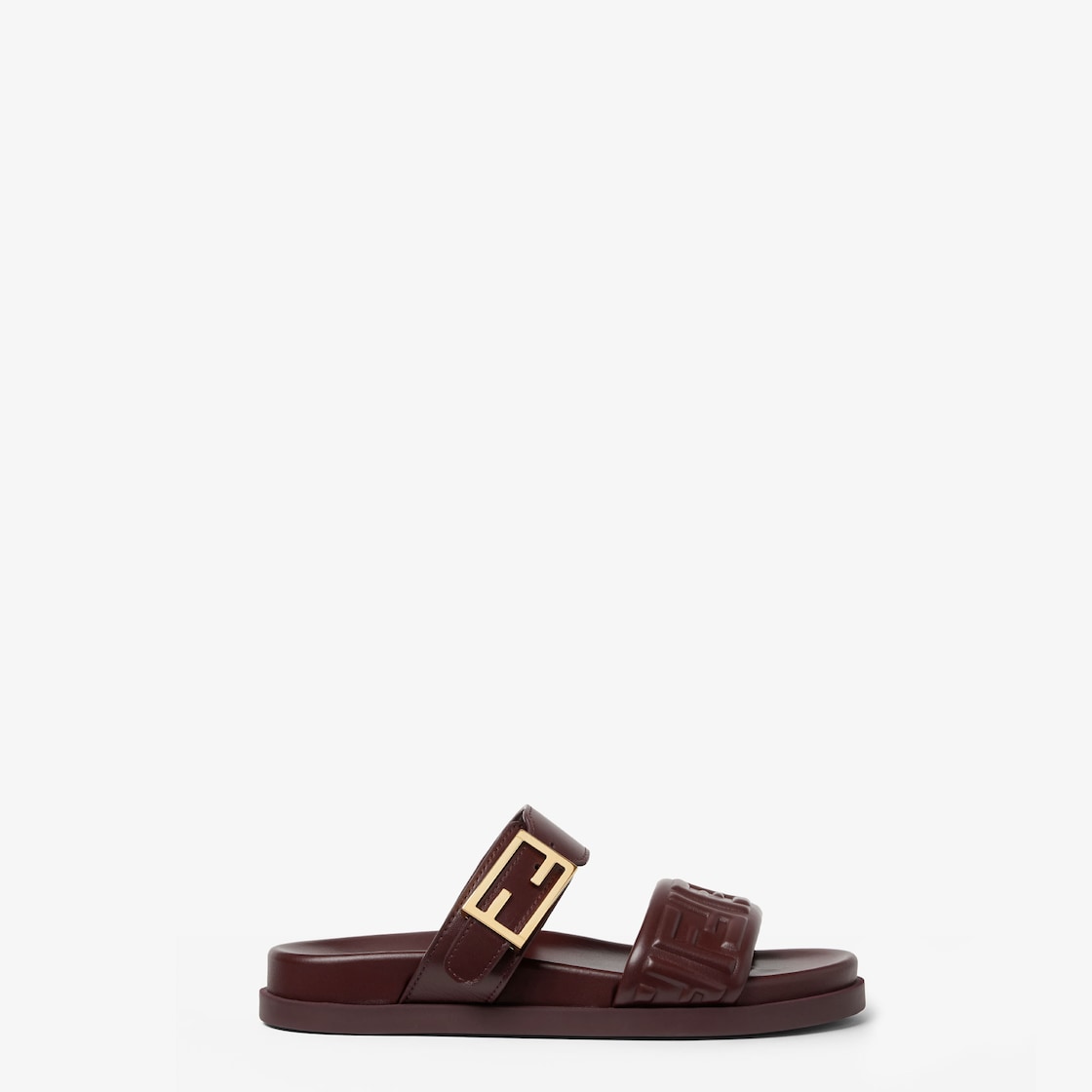 صندل Slide بشريط مزدوج مع مشبك مزيّن بعلامة FF Baguette.مصنوع من جلد النابا (nappa) باللون العنّابي مع علامة FF ثلاثية الأبعاد على الشريط الأمامي.زينة معدنية باللون الذهبي.