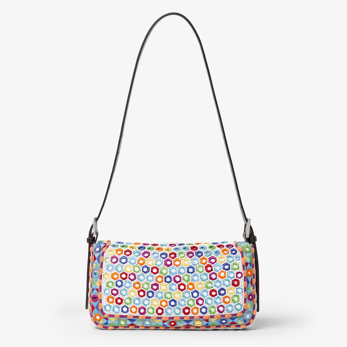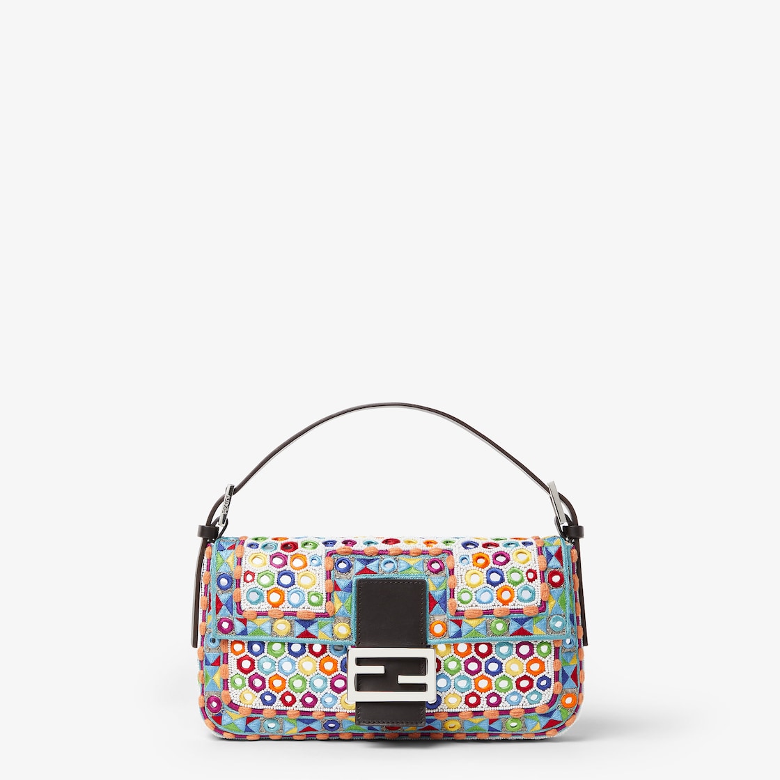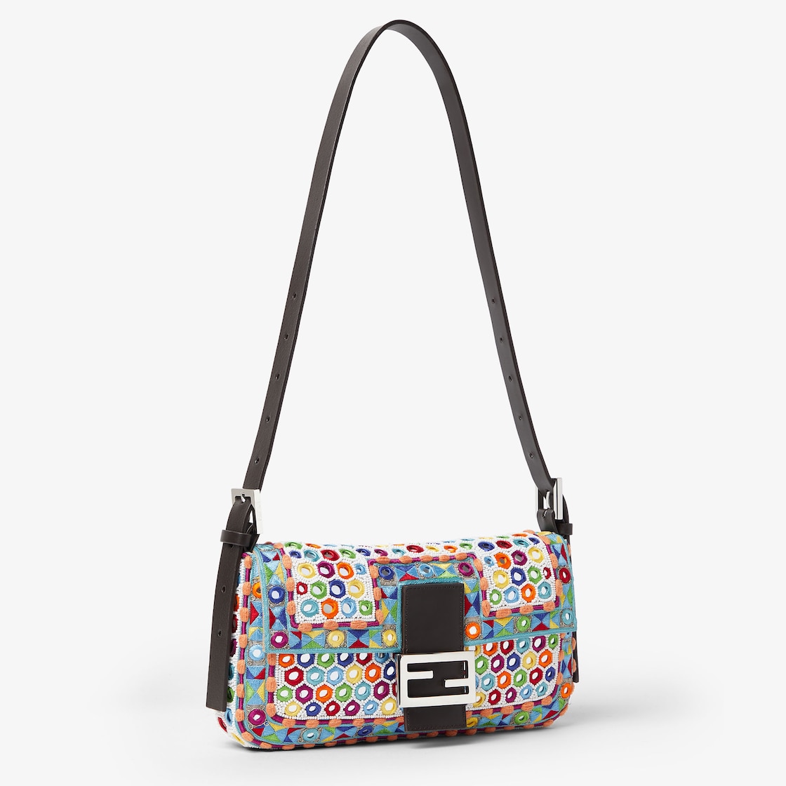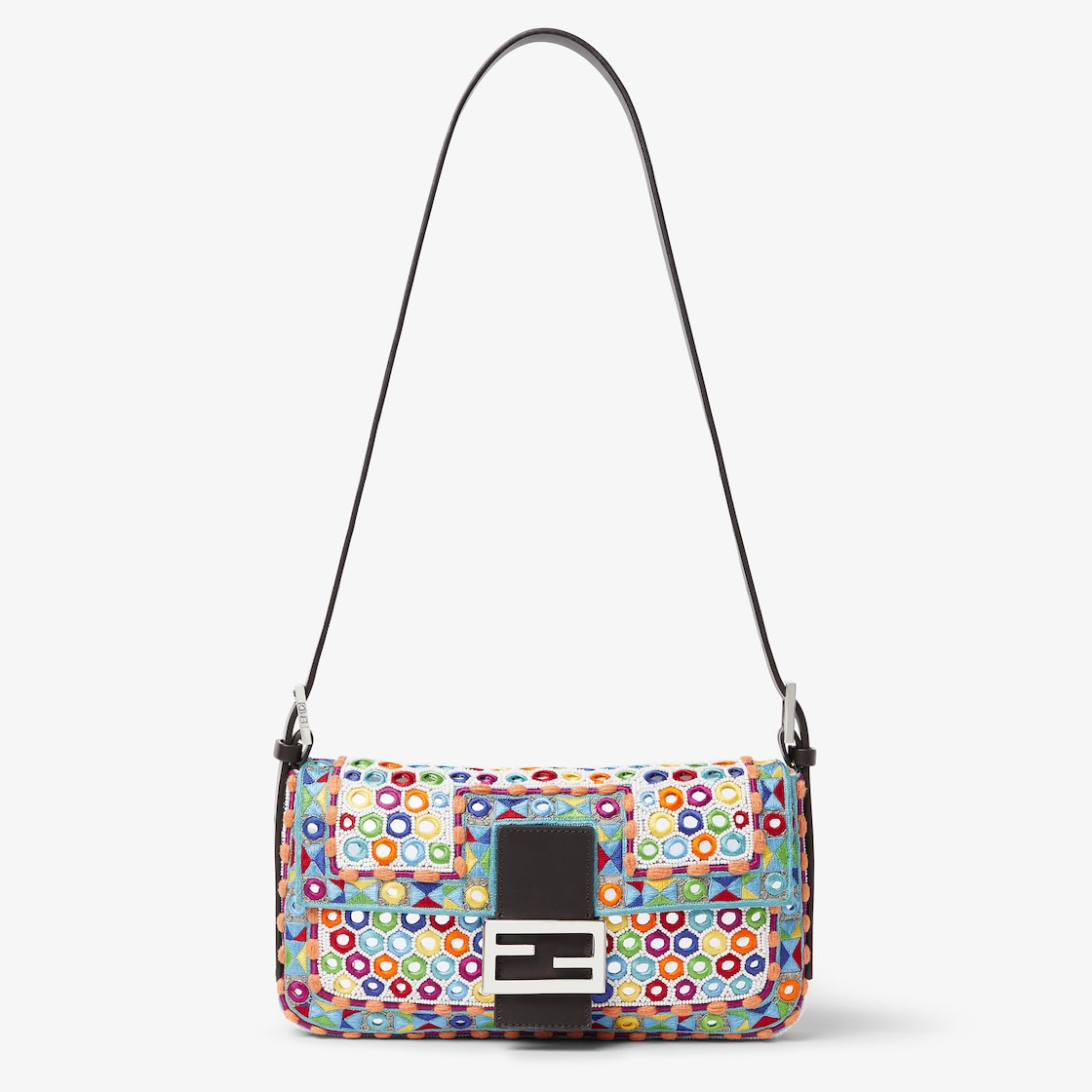منذ إطلاق هذه الحقيبة لأول مرة في عام 1997، أصبحت أيقونة دار فندي، وقد أعيد ابتكارها الآن لمجموعة خريف وشتاء 2026-2027 بتصميم مستوحى من إصدارها الأصلي رقم 26424.مُطرّزة يدوياً بالكامل بمزيج راقٍ من الخامات والألوان مع 39500 خرزة و475 مرآة، وقد استغرق تنفيذها أكثر من 138 ساعة من العمل الحرفي.تتميز حقيبة ®Baguette بمقبض وحزام كتف من جلد العجل باللون البني الداكن، قابلين للتعديل والإزالة من أجل استخدامات متعددة وراحة قصوى، فضلاً عن مشبك FF المميز بلمسة نهائية من البلاديوم (palladium).يتميز الأكسسوار بفتحة أمامية مع مشبك مغناطيسي، وقسم داخلي مبطّن بالكامل من كتان Lario، وجيب داخلي بسحّاب دائري.علامة Re Edition وتفاصيل من المعدن بلمسة نهائية من البلاديوم (palladium).