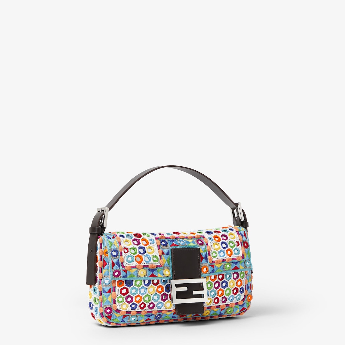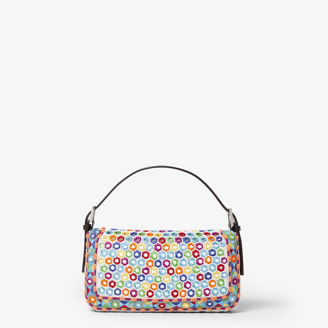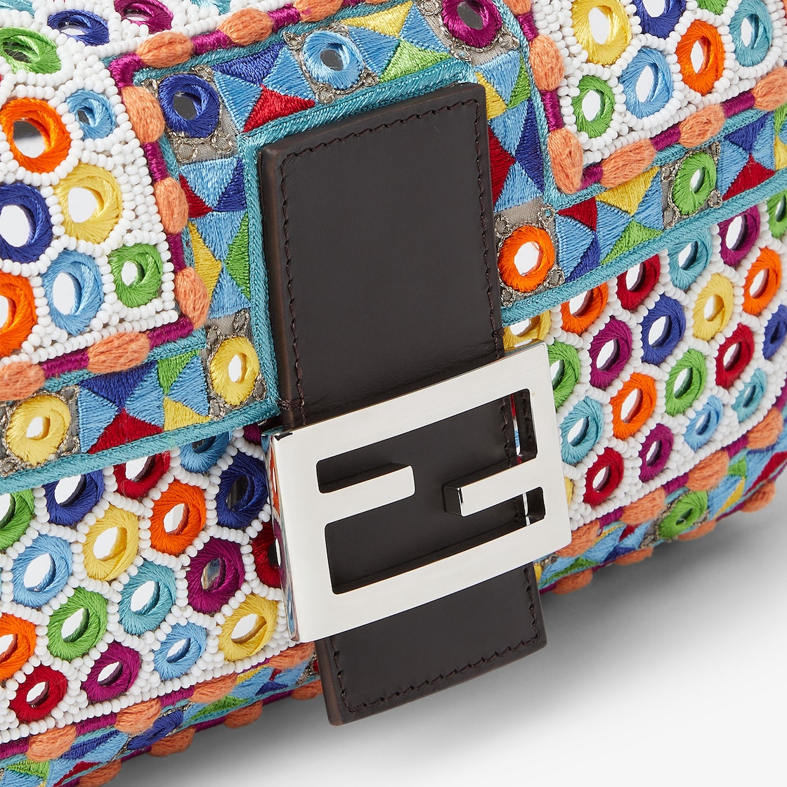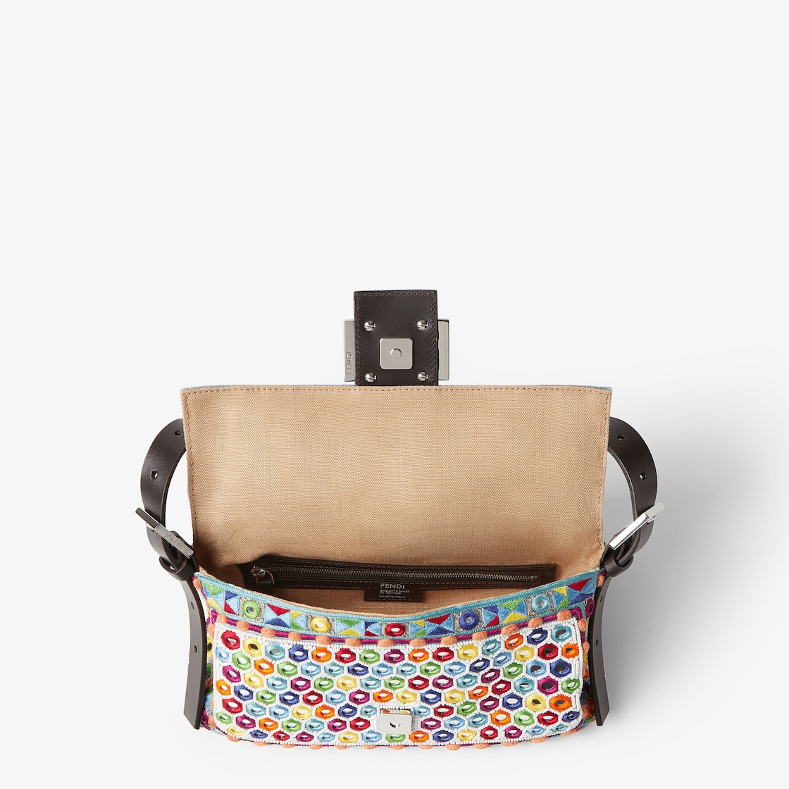 منذ إطلاق هذه الحقيبة لأول مرة في عام 1997، أصبحت أيقونة دار فندي، وقد أعيد ابتكارها الآن لمجموعة خريف وشتاء 2026-2027 بتصميم مستوحى من إصدارها الأصلي رقم 26424.مُطرّزة يدوياً بالكامل بمزيج راقٍ من الخامات والألوان مع 39500 خرزة و475 مرآة، وقد استغرق تنفيذها أكثر من 138 ساعة من العمل الحرفي.تتميز حقيبة ®Baguette بمقبض وحزام كتف من جلد العجل باللون البني الداكن، قابلين للتعديل والإزالة من أجل استخدامات متعددة وراحة قصوى، فضلاً عن مشبك FF المميز بلمسة نهائية من البلاديوم (palladium).يتميز الأكسسوار بفتحة أمامية مع مشبك مغناطيسي، وقسم داخلي مبطّن بالكامل من كتان Lario، وجيب داخلي بسحّاب دائري.علامة Re Edition وتفاصيل من المعدن بلمسة نهائية من البلاديوم (palladium).