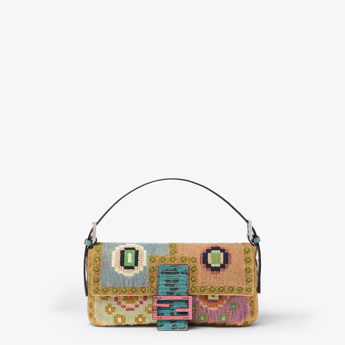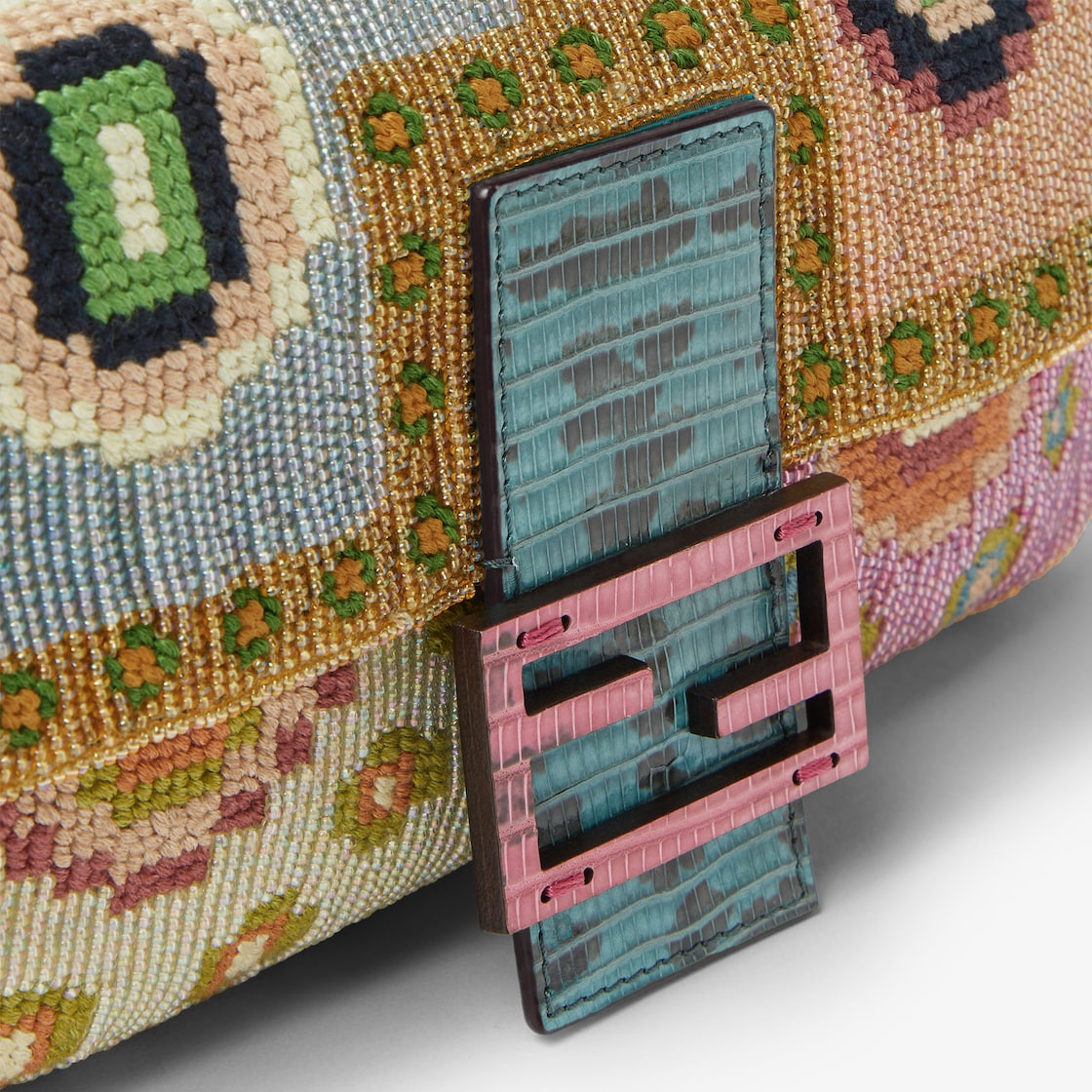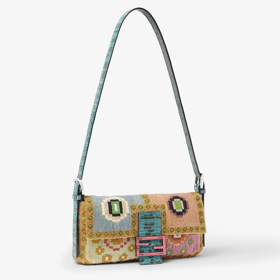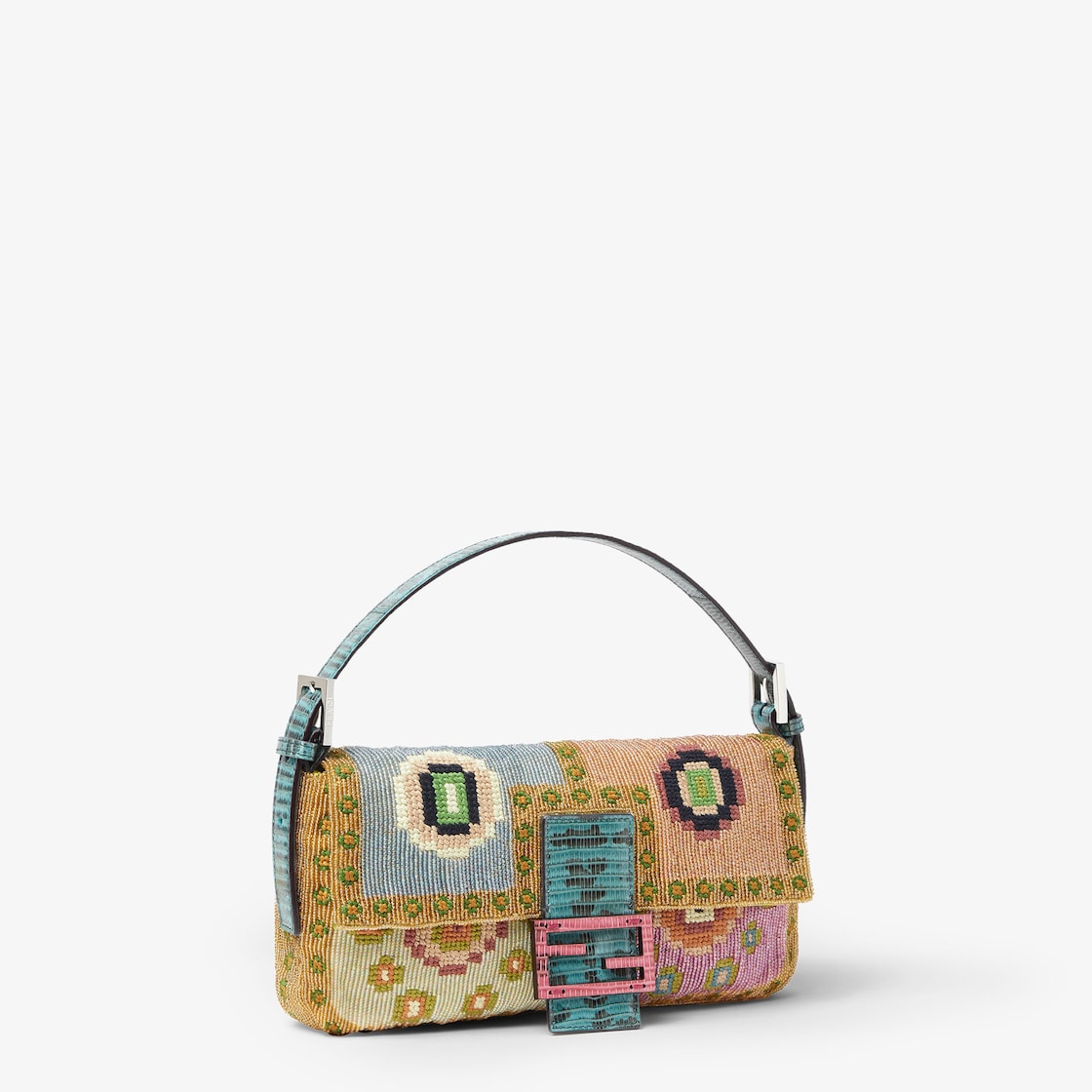منذ إطلاق هذه الحقيبة لأول مرة في عام 1997، أصبحت أيقونة دار فندي، وقد أعيد ابتكارها الآن لمجموعة خريف وشتاء 2026-2027 بتصميم مستوحى من إصدارها الأصلي رقم 26424.الحقيبة مطرزة يدوياً بتداخل غني من الخامات، وتضم 51400 خرزة وخيوطاً منسوجة بإتقان تشكّل علامة نابضة بالحياة ومتعددة الألوان، وقد استغرق تنفيذها أكثر من 173 ساعة من الحرفية العالية.تتميز حقيبة ®Baguette بمقبض وحزام كتف من جلد السحلية تيجو (Tegu) الفاخر باللون الأزرق الفاتح قابلَين للتعديل والإزالة من أجل استخدامات متعددة وراحة قصوى، فضلاً عن مشبك FF المميز من جلد السحلية تيجو (Tegu) بلون متباين.يتميز الأكسسوار بفتحة أمامية مع مشبك مغناطيسي، وقسم داخلي مبطّن بالكامل من الساتان (satin) باللون الأخضر المائل إلى الأصفر، وجيب داخلي بسحاب دائري.علامة Re Edition وتفاصيل من المعدن بلمسة نهائية من البلاديوم (palladium).