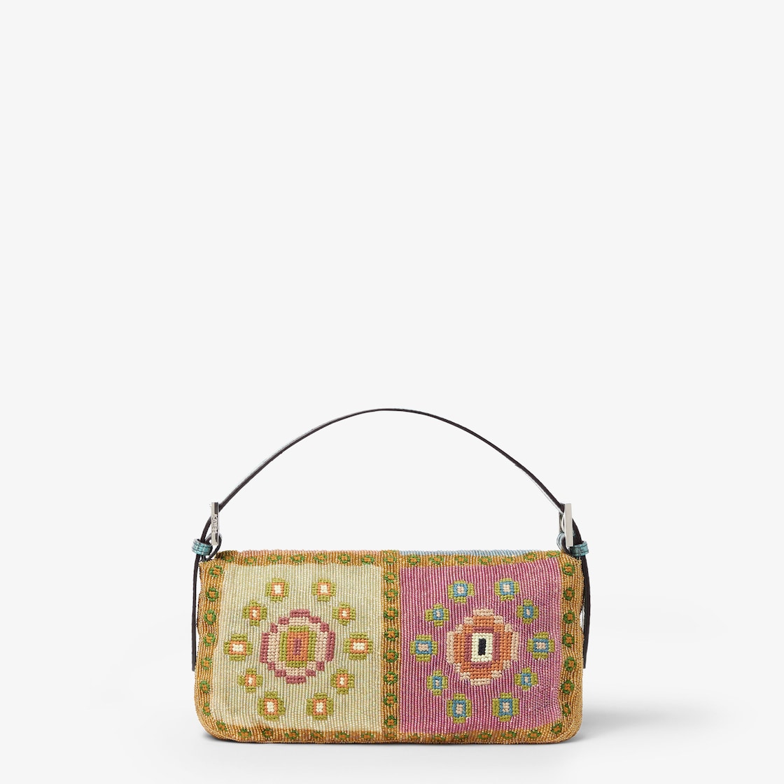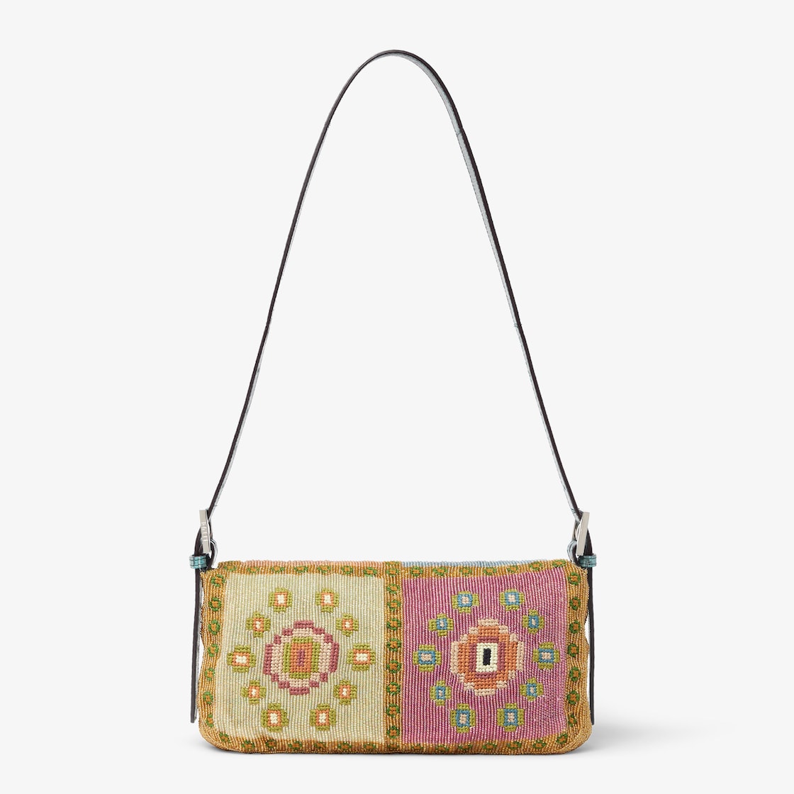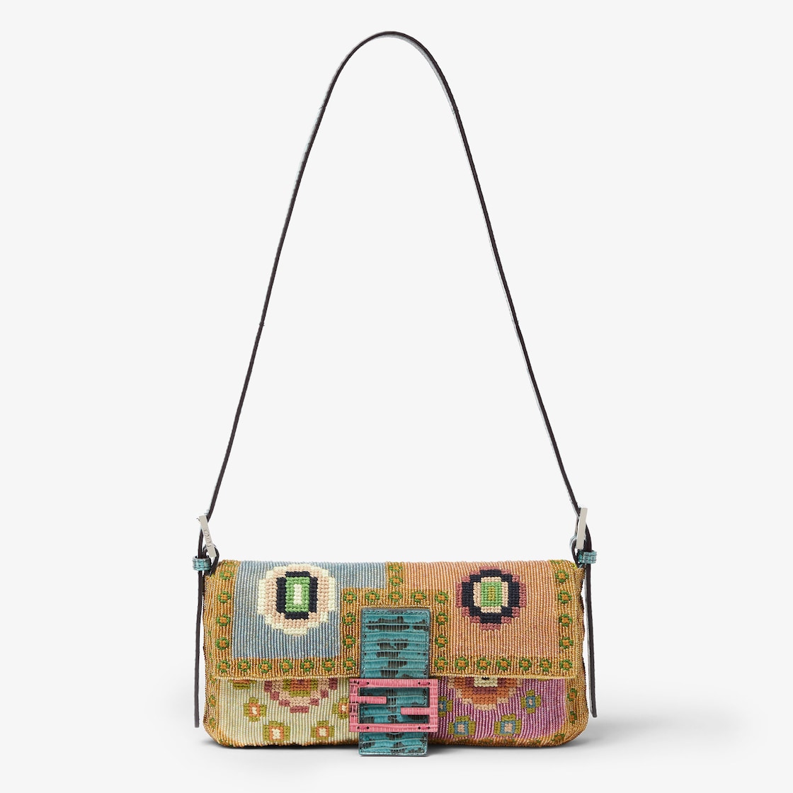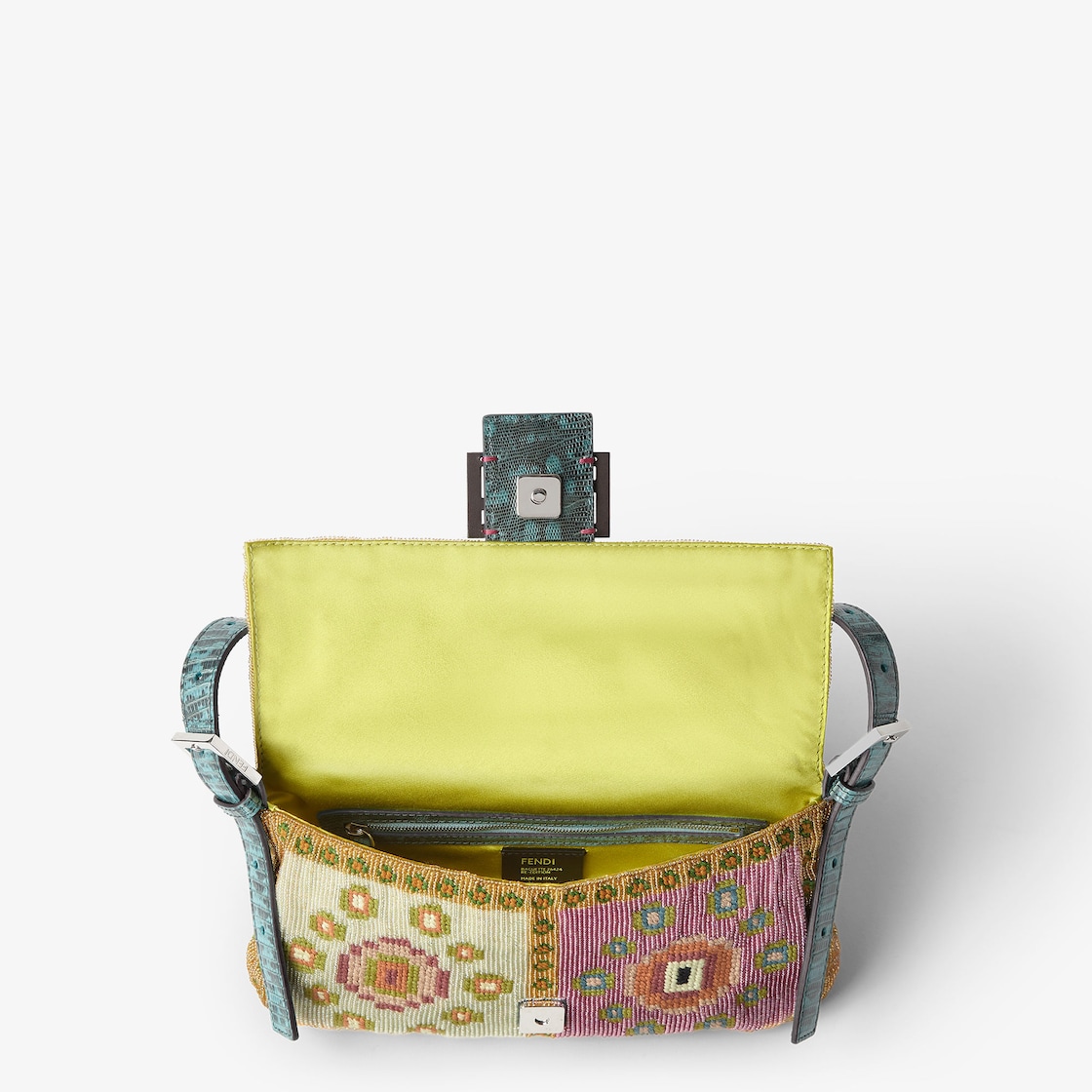 منذ إطلاق هذه الحقيبة لأول مرة في عام 1997، أصبحت أيقونة دار فندي، وقد أعيد ابتكارها الآن لمجموعة خريف وشتاء 2026-2027 بتصميم مستوحى من إصدارها الأصلي رقم 26424.الحقيبة مطرزة يدوياً بتداخل غني من الخامات، وتضم 51400 خرزة وخيوطاً منسوجة بإتقان تشكّل علامة نابضة بالحياة ومتعددة الألوان، وقد استغرق تنفيذها أكثر من 173 ساعة من الحرفية العالية.تتميز حقيبة ®Baguette بمقبض وحزام كتف من جلد السحلية تيجو (Tegu) الفاخر باللون الأزرق الفاتح قابلَين للتعديل والإزالة من أجل استخدامات متعددة وراحة قصوى، فضلاً عن مشبك FF المميز من جلد السحلية تيجو (Tegu) بلون متباين.يتميز الأكسسوار بفتحة أمامية مع مشبك مغناطيسي، وقسم داخلي مبطّن بالكامل من الساتان (satin) باللون الأخضر المائل إلى الأصفر، وجيب داخلي بسحاب دائري.علامة Re Edition وتفاصيل من المعدن بلمسة نهائية من البلاديوم (palladium).
