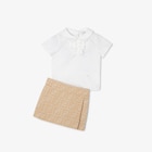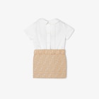 فستان للمواليد (من 0 إلى 24 شهراً) مع قميص من البوبلين (poplin) باللون الأبيض بكشكشة وتنورة من الجاكار باللون البيج وشعار FF عليه بالكامل بدرجات مختلفة من اللون نفسه.