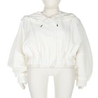سترة bomber قصيرة برقبة عالية وقلنسوة برباط قابلة للإزالة.أكمام واسعة منخفضة وطرف مطاطي.إغلاق بسحاب مخفي مع شريط مزدوج.مصنوع من الفيسكوز (viscose) Tech fabric باللون الأبيض.سحّاب رأسي في الجهة الأمامية.