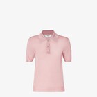 كنزة بتصميم قميص بولو ضيق.رقبة كلاسيكية مع أزرار إغلاق بلون متناسق وأكمام قصيرة.مصنوعة من نسيج الفيسكوز (viscose) اللامع فائق النعومة باللون الوردي الفاتح.علامة Fendi بلون متباين مطرّزة على الجهة الأمامية.