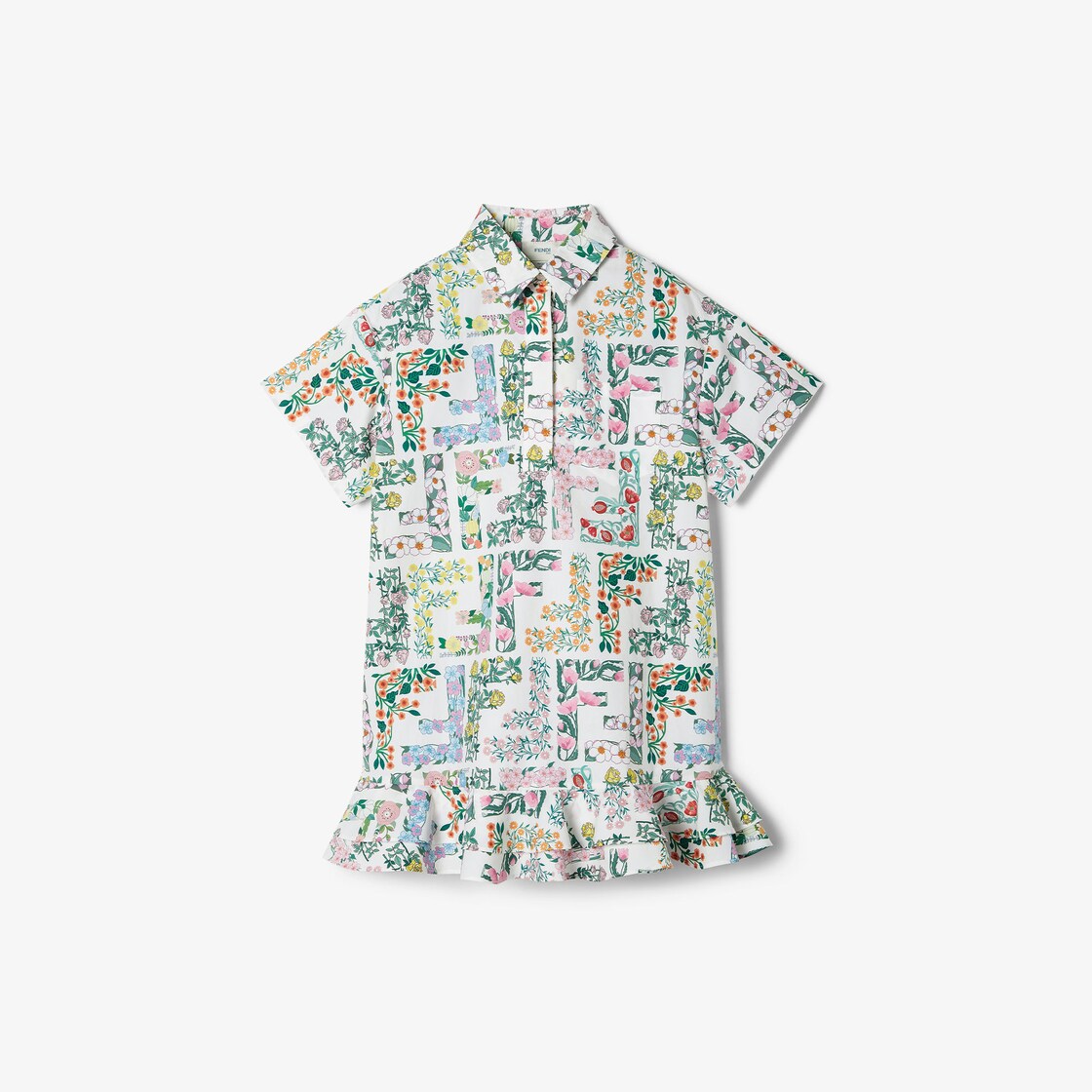 فستان للأطفال مصنوع من البوبلين (poplin) مع طبعة زهور وعلامة FF متعددة الألوان عليه بالكامل وكشكشة على الطرف.