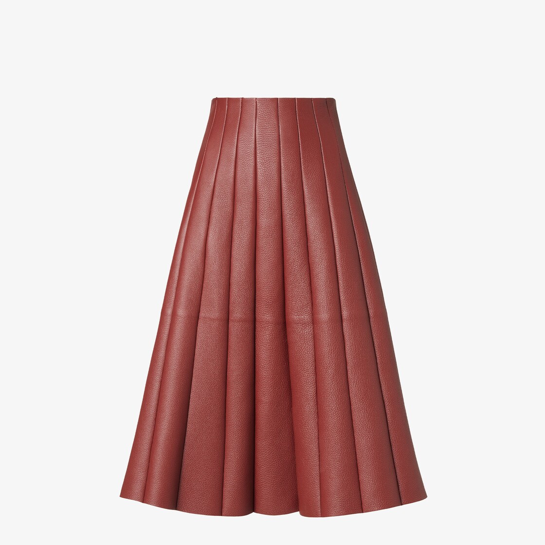 تنورة متوسطة الطول تتسع من الأسفل مع إغلاق بسحاب. مصنوعة من جلد الغزال باللون البني البرتقالي بحِرفية مستوحاة من علامة Pequin الأيقونية. تصميم اللوحة العمودية مع الدرزات الظاهرة يعيد تشكيل تأثير الطيّات التقليدي.