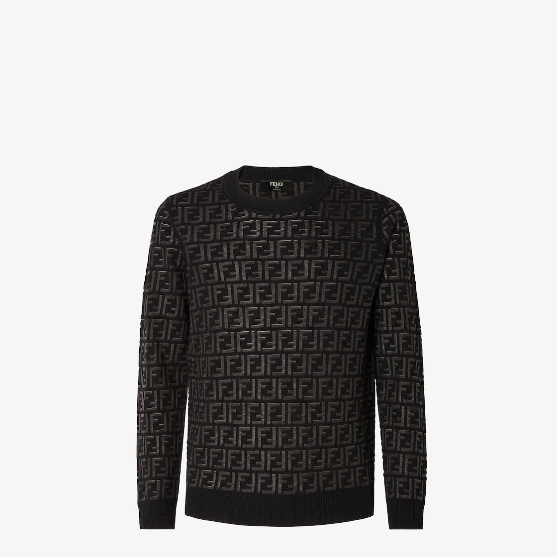 بلوفر برقبة مستديرة وقصة عادية. خامة من الصوف الأسود. زخرفة FF بتطعيمات من النايلون تخلق مظهرًا شفافًا بنفس الألوان.