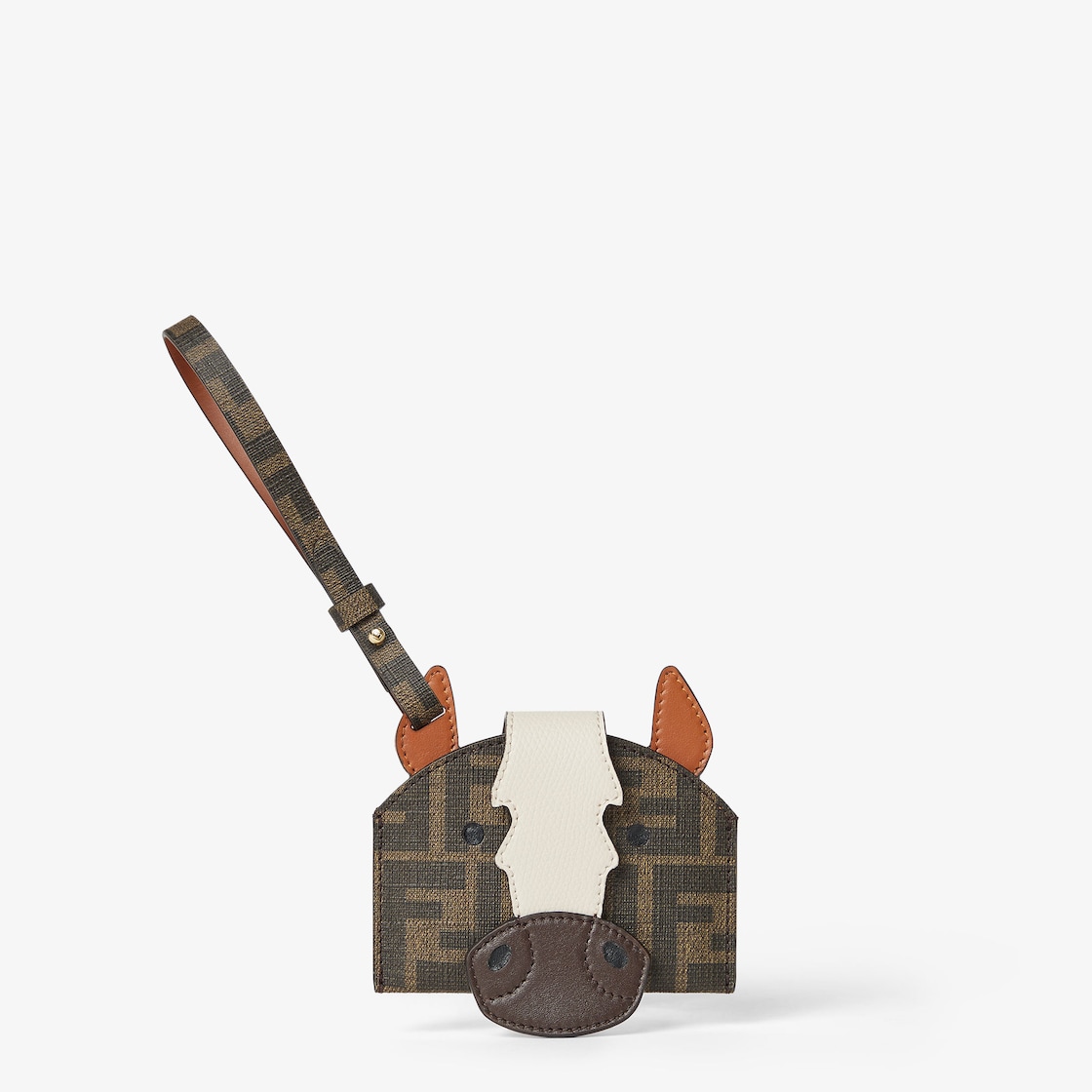 حاملة بطاقات Fendi Best Friends Forever بتصميم رأس حصان. تتميز بقسم داخلي ومشبك بجسر وزر كبس مخفي. حزام من الجلد لتثبيتها على الحقائب والأحزمة. مصنوعة من القماش مع علامة FF الأيقونية وتفاصيل باللونين الأبيض والبني. زينة معدنية باللون الذهبي.
