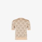 كنزة قصيرة برقبة مستديرة وأكمام قصيرة. مصنوعة من جاكار الفيسكوز (viscose) مع تصميم باقة زهور باللون الوردي الخوخي. أطراف مضلّعة بلون سادة.