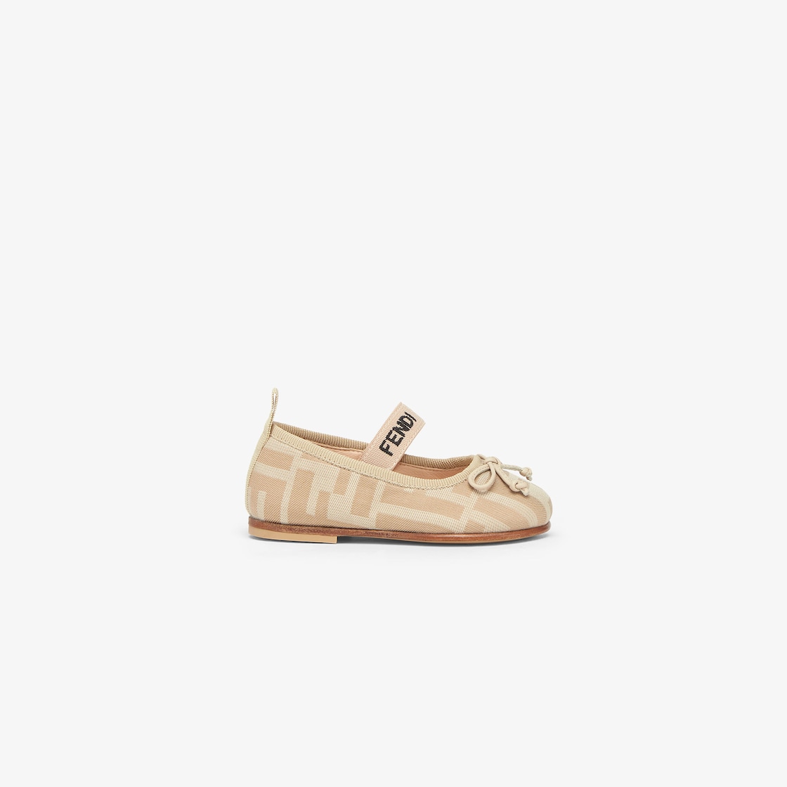 حذاء ballet للأطفال الصغار بمُقدمة مدوّرة. مصنوع من قماش الجاكار ومزيّن بشعار FF باللون البيج بدرجات مختلفة من اللون نفسه عليه بالكامل. عقدة أنيقة في الجهة الأمامية مع شريط مطاطي باللون البني الفاتح (nude) يلتف حول القدم.