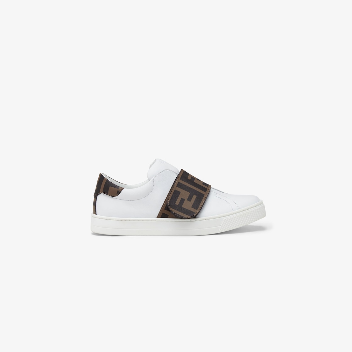 حذاء رياضي للجنسين من جلد النابا الأبيض، يتميز بنعل مطاطي وإغلاق كبير فيلكرو بزخرفة FF باللون البني التبغي الأيقوني.