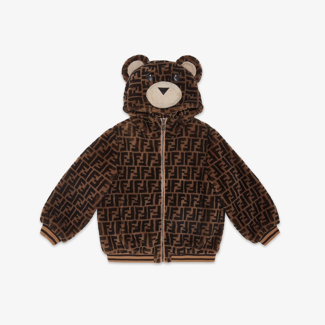 جاكت بومبر للأطفال، من الشيرلينج، مع قلنسوة على شكل دب، وشعار FF بلون التبغ على كامل القطعة.