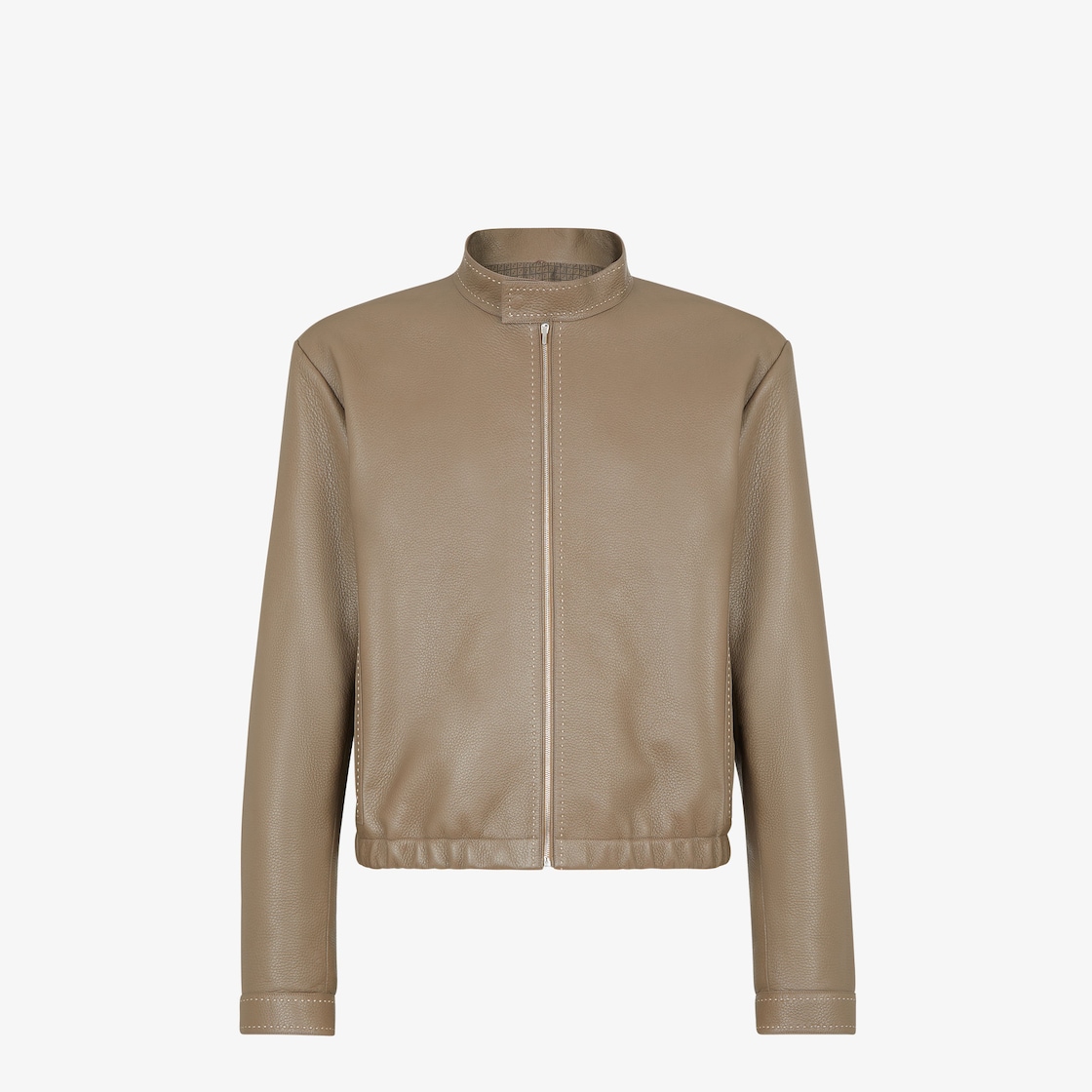 بلوزون قصير مع رقبة بتصميم مندرين (mandarin) وأكمام طويلة. جيبان جانبيان بسحاب. إغلاق بسحاب ظاهر. مصنوع من جلد الغزال باللون البني الفاتح. مزيّن بدرزات Selleria بلون متباين وعلامة في الجهة الخلفية من الرقبة مع Fendi Roma مطرزة بالحروف بلون متناسق. بطانة من القماش مع طباعة FF مايكرو.