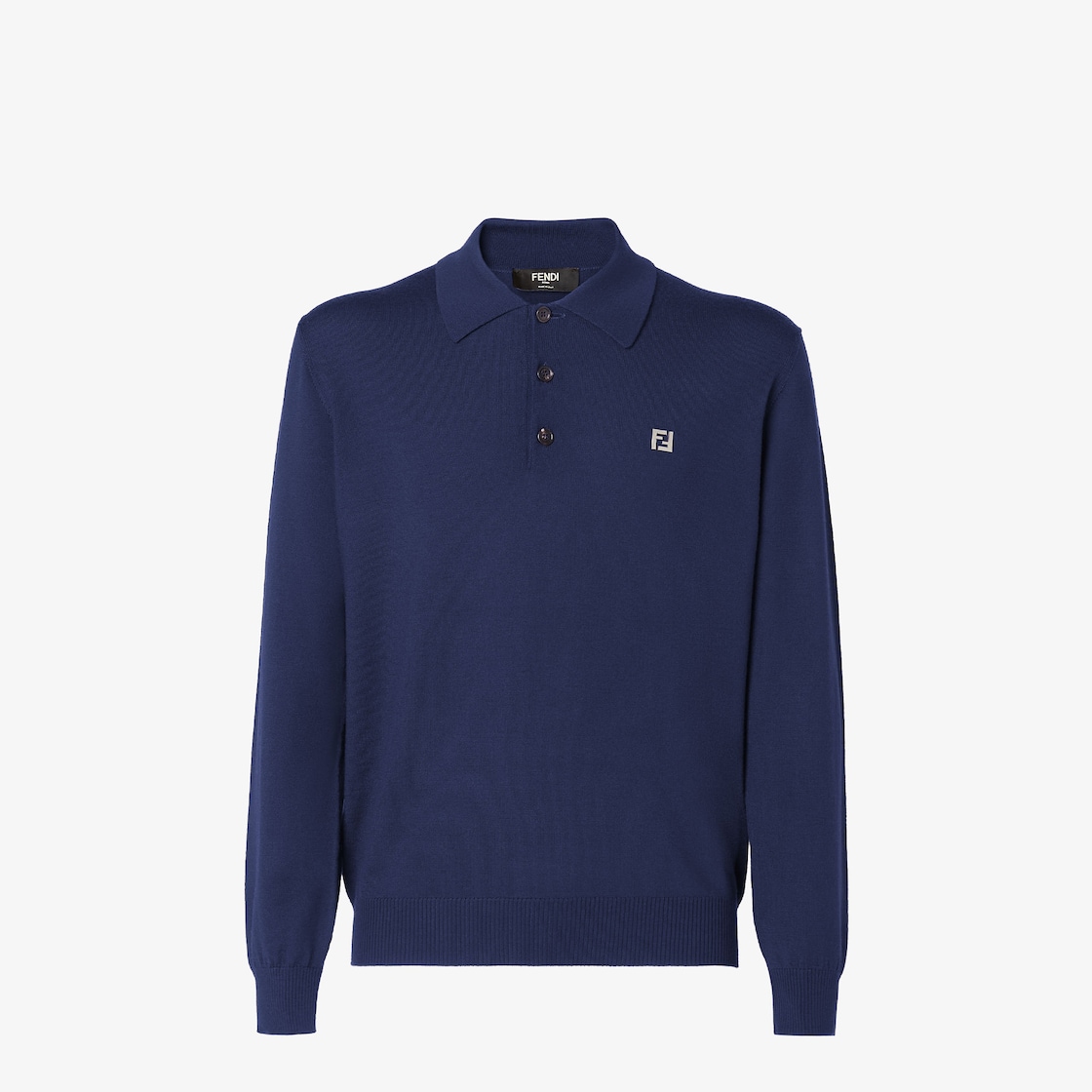 قميص بولو بأكمام طويلة.يتميز هذا التصميم برقبة كلاسيكية مع إغلاق بأزرار.مصنوع من الصوف المحبوك باللون الأزرق.مزين بطباعة FF مايكرو من معدن بلمسة نهائية من البلاديوم (palladium) في الجهة الأمامية.