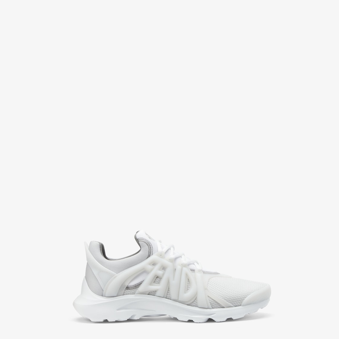 حذاء رياضي سهل الارتداء مصنوع من شبك tech أبيض مع تفاصيل نيوبرين (neoprene) باللون الأبيض. حروف Fendi كبيرة الحجم على الجوانب وتفاصيل مطاطية شبه شفافة. نعل خارجي للجري مرن مطاطي وخفيف الوزن.