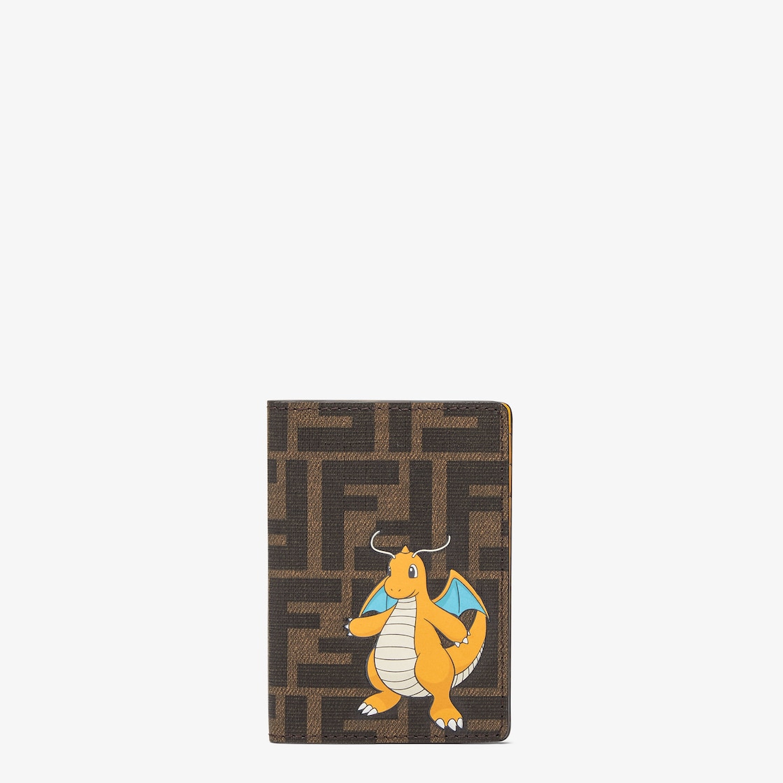 حاملة بطاقات صغيرة بطيّة مزدوجة من تعاون FENDI x FRGMT x POKÉMON احتفالاً بعام التنين. القسم الداخلي يحتوي على ثلاث فتحات داخلية للبطاقات وجيب واحد في الداخل وعلى الجهة الخلفية. مصنوعة من قماش مع علامة FF من الجاكار وطبعة شخصية دراجونايت (Dragonite). بطانة من الجلد باللون الأصفر.