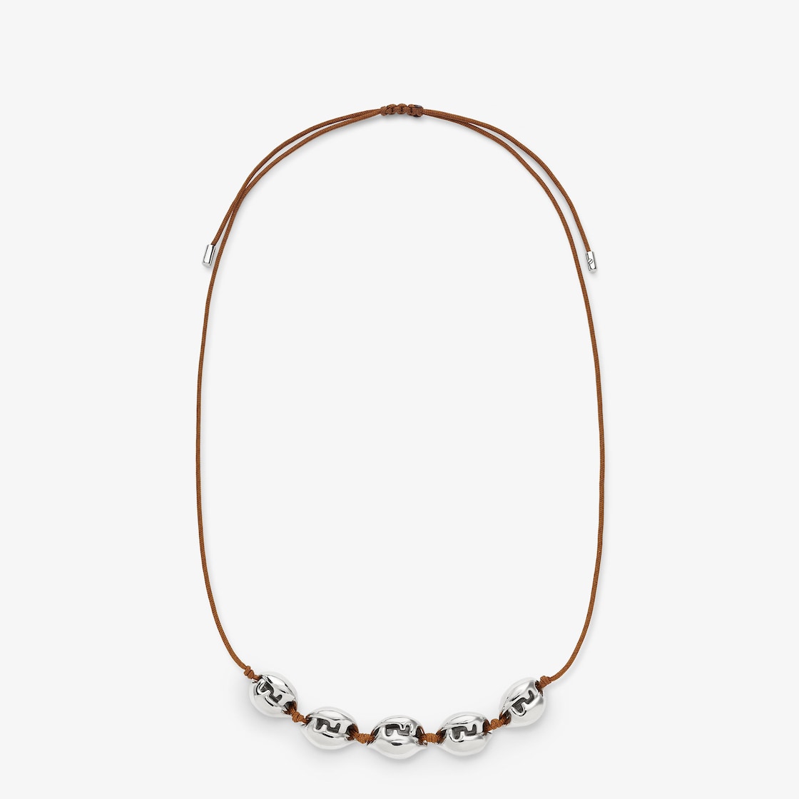 قلادة مصنوعة من شريط باللون البني مع عُقد انزلاقية وأطراف معدنية. مزيّنة بخمس صدفات معدنية بلمسة نهائية من البلاديوم (palladium)، محفور عليها شعار FF.