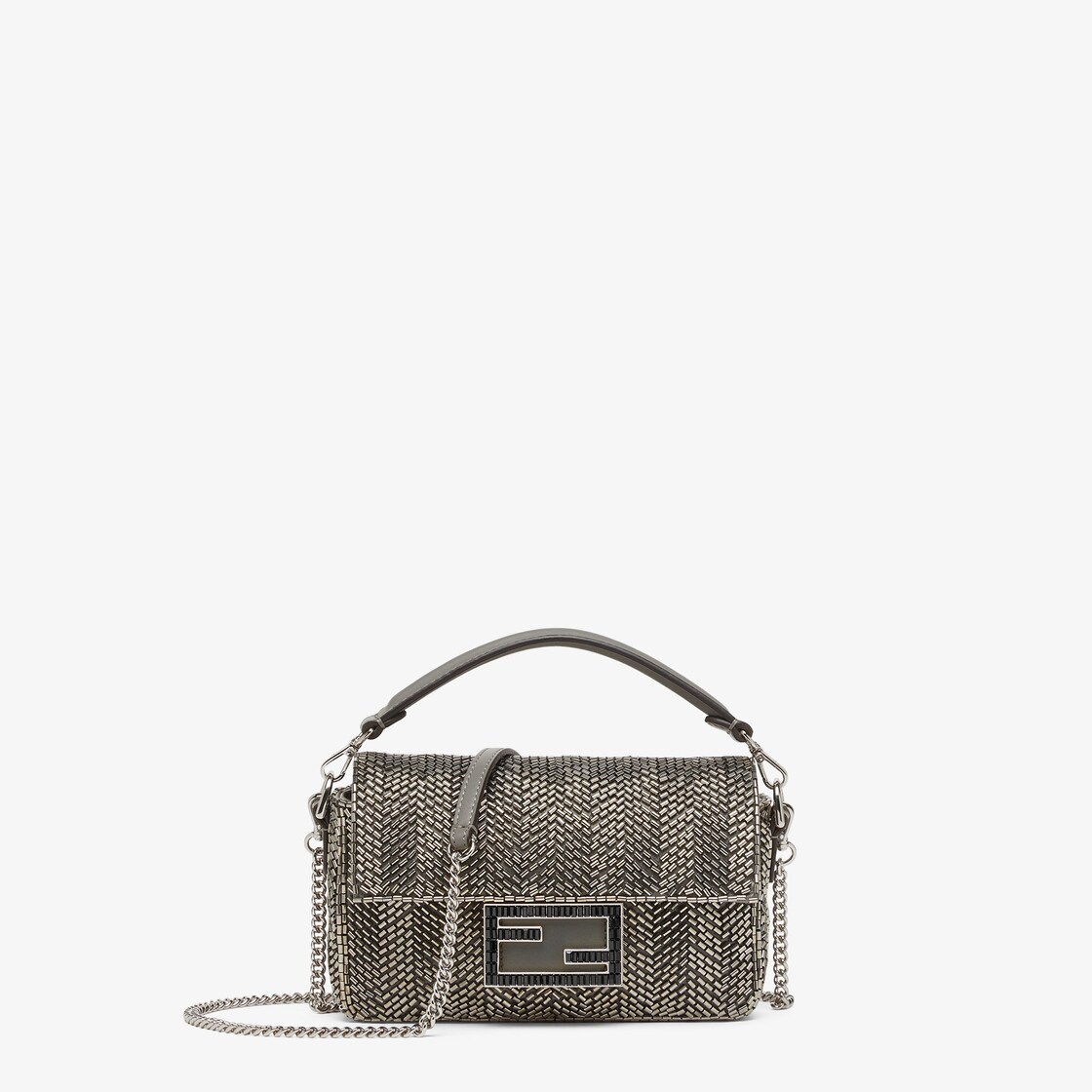 حقيبة Baguette الأيقونية بحجم صغير، مطرزة بأكثر من 5,800 حبة خرز زجاجية باللون الرمادي، على شكل علامة خطوط متعرّجة. تقليم من جلد العجل بدرجات مختلفة من اللون نفسه ومشبك FF مزيّن بالكريستال.