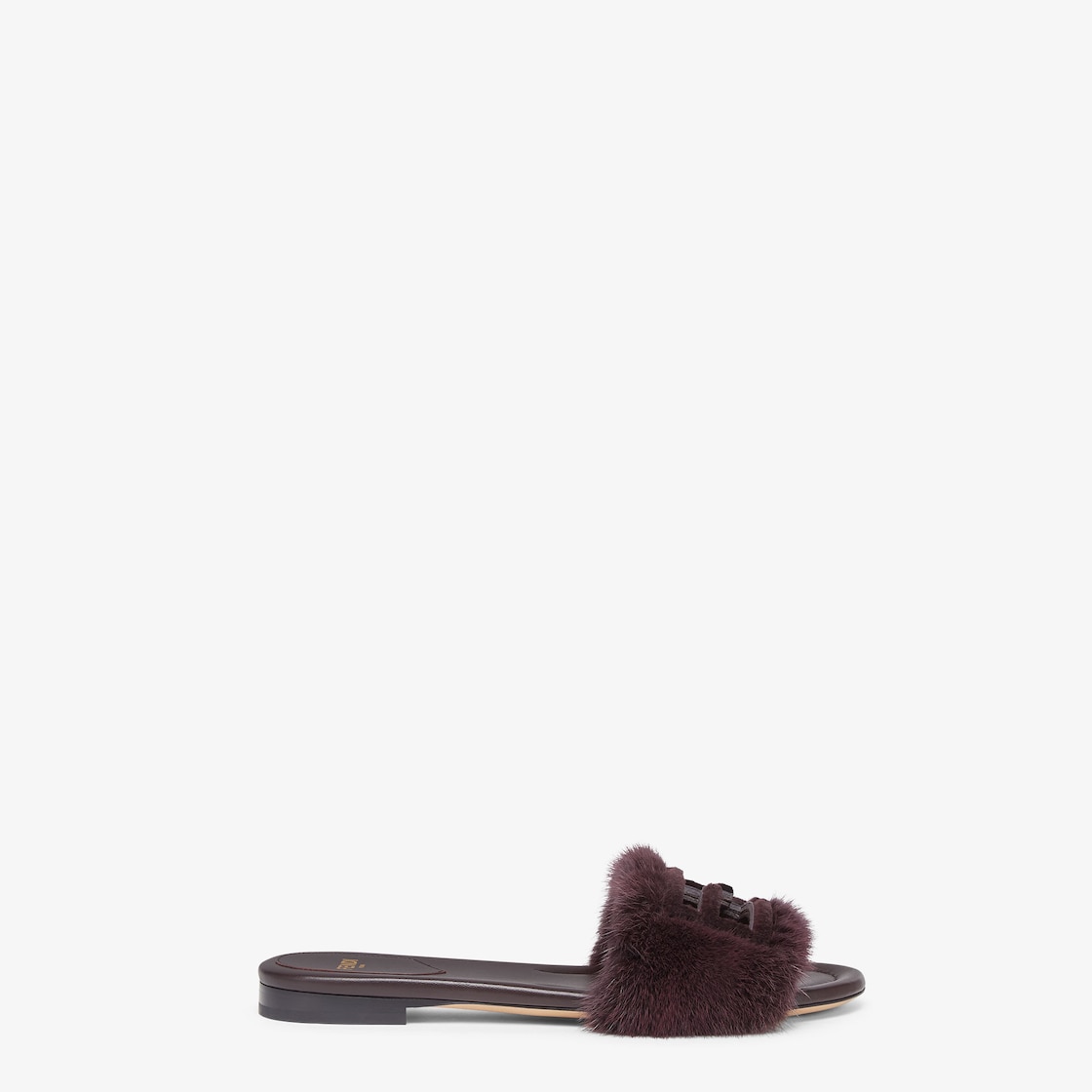 صندل بشريط عريض. مصنوع من فرو المنك (mink) باللون البنفسجي الداكن. مزين بعلامة FF Baguette بدرجات مختلفة من اللون نفسه.