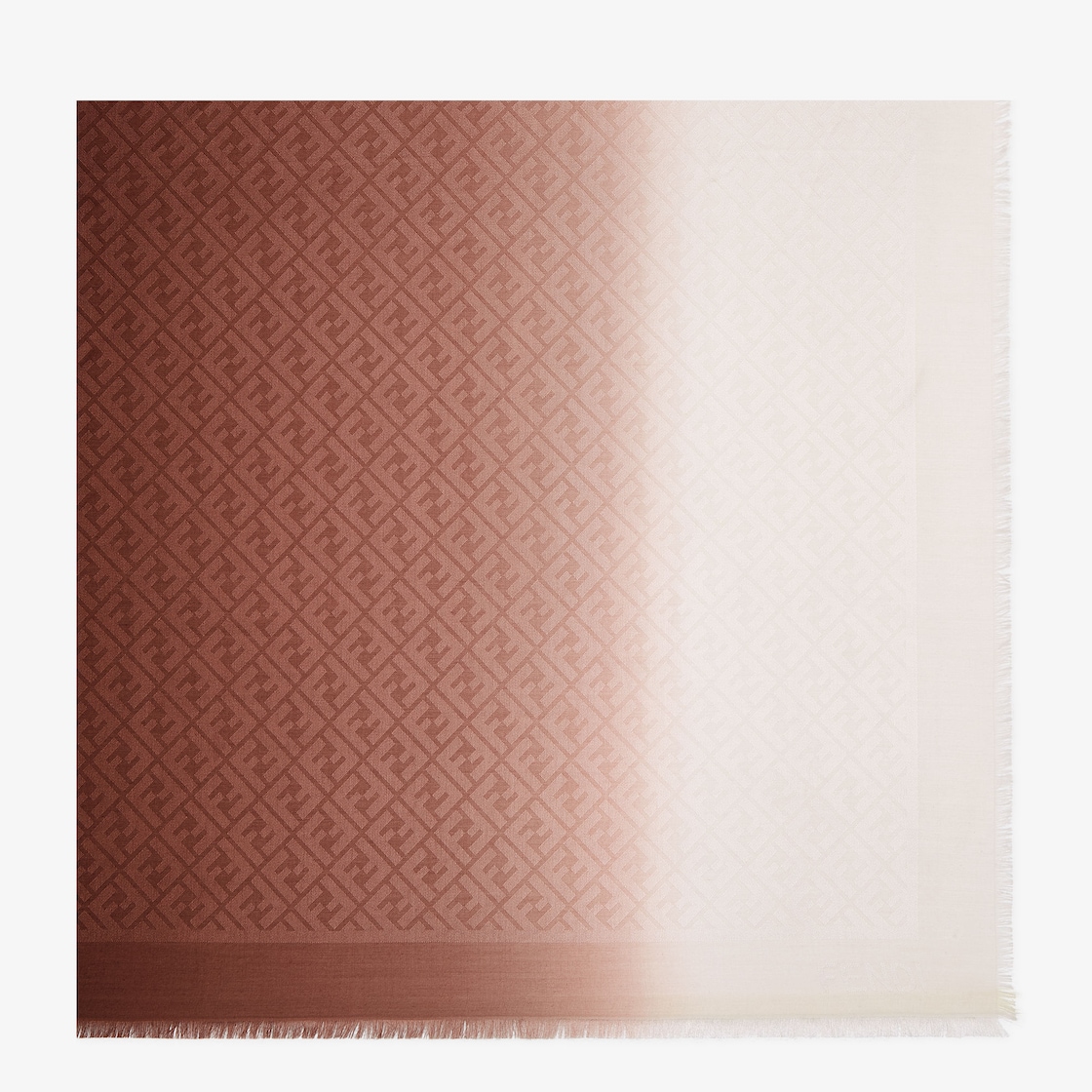 شال كبير مربع مصنوع من مزيج ناعم من الصوف والحرير. تشكّل خلفية الجاكار شعار FF الأيقوني على كامل التصميم. تنساب الطبعة التدريجية برقة من اللون البني إلى ألوان أفتح. أطراف مع أهداب.