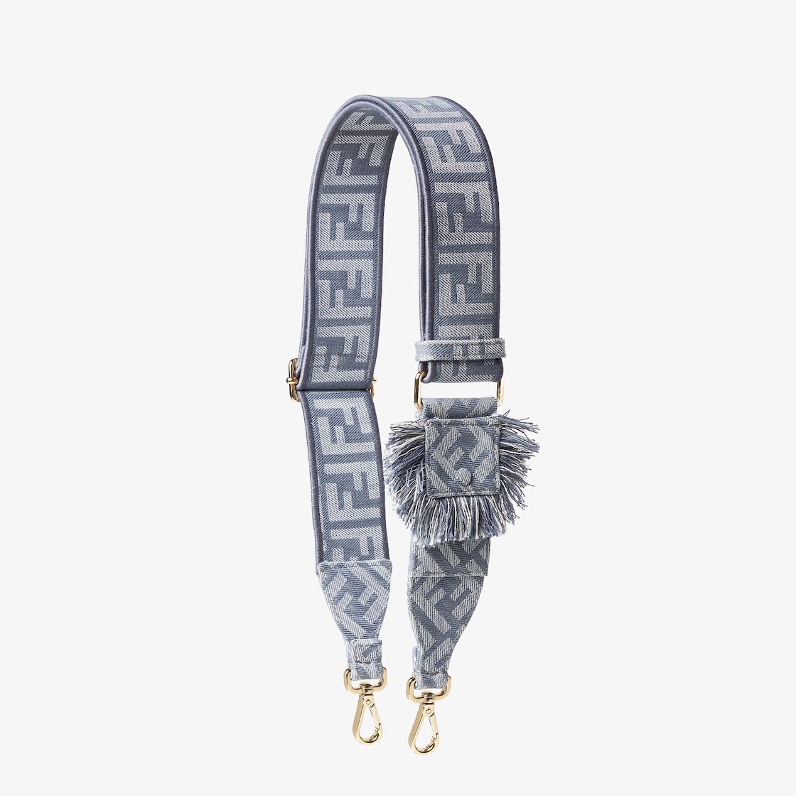 حزام كتف طويل قابل للتعديل بمشبك مزدوج، يمكن استخدامه مع أي حقيبة ذات مشابك إغلاق. مصنوع من جاكار القطن يرسم شعار FF بتأثير الدنيم. جيب عملي صغير مزين بأهداب. زينة معدنية باللون الذهبي.
